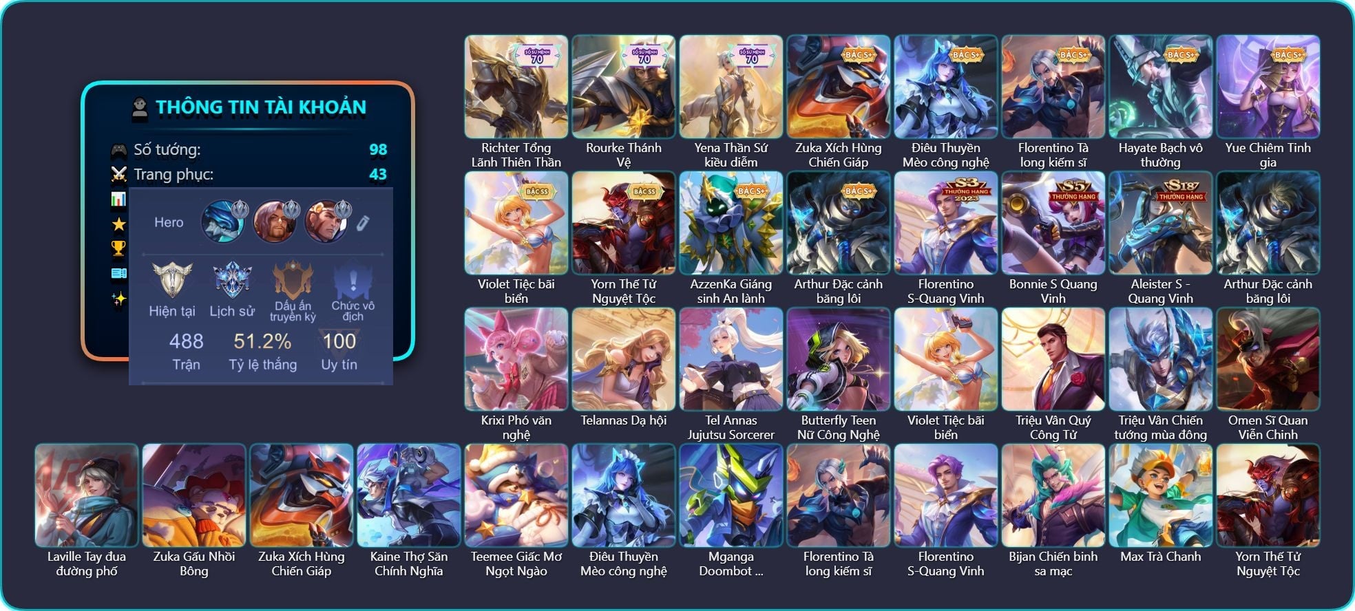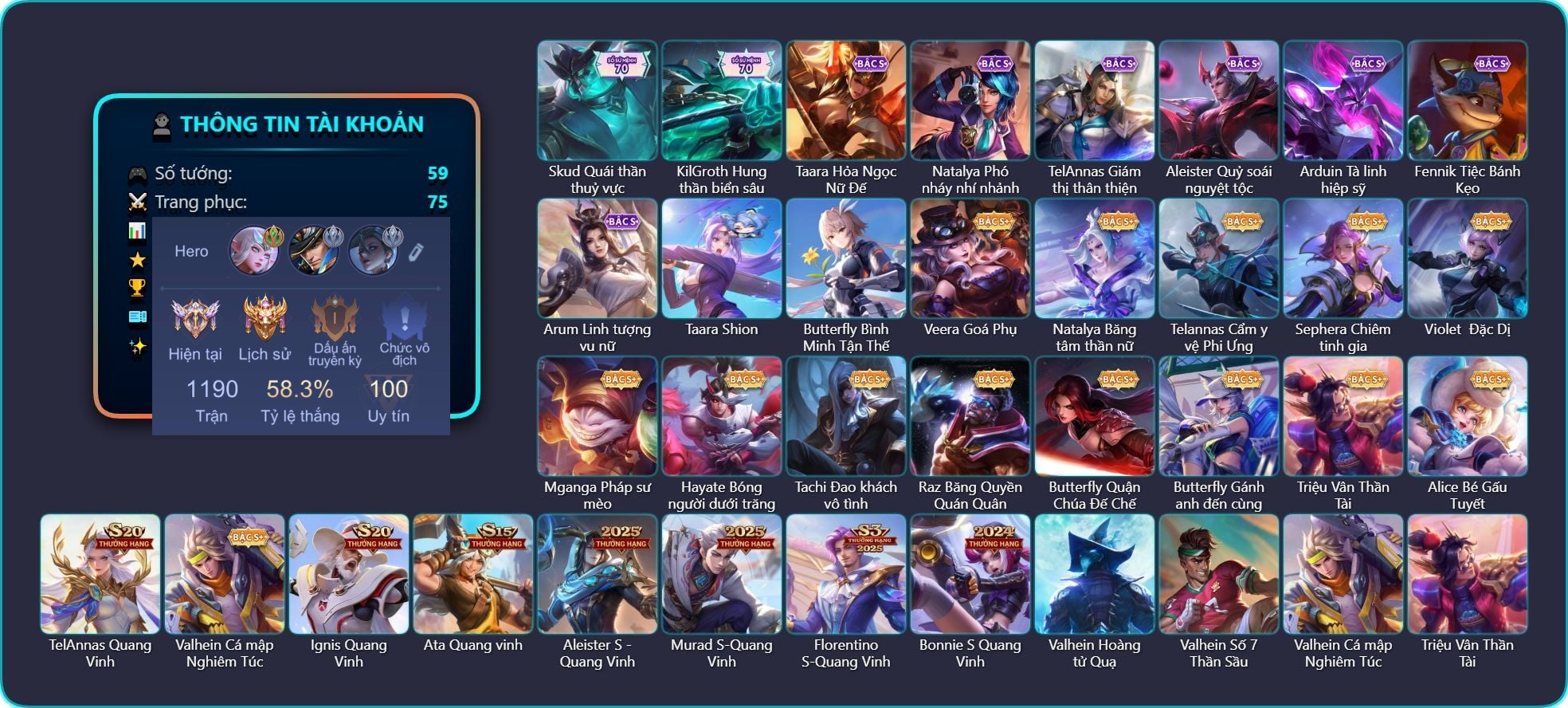 Valhein Hoàng tử Quạ, Valhein S-Quang Vinh, Taara Đại tù trưởng, Taara Hỏa Ngọc Nữ Đế, Veera Y Tá Bạo Loạn, Gildur phượt thủ, Gildur Đại gia học viện, Kriknak Bọ Cánh Bạc, Krixi Thần Thoại Hy Lạp, Krixi Thuỷ Thủ, Toro Đặc cảnh NYPD, Toro Bạch mao Ngưu, Natalya Quý Cô Thủy Tề, Lauriel Đọa Lạc Thiên Sứ, Airi Thích Khách, Airi Ninja Xanh Lá, Airi Lễ hội mùa xuân, KilGroth Quang Vinh, Helen Cảnh Vệ Rừng, Helen Ngủ trong rừng, Zuka Đại Phú Ông, Thane Mật vụ, Maloch Ác Ma Địa Ngục, Maloch Tiệc hóa trang, Maloch Samurai Tử Sĩ, Maloch Ác nhân vô tuyến, Lữ Bố Nam Vương, Lữ Bố Hoả Long Chiến Thần, Butterfly Teen Nữ Công Nghệ, Violet Nữ đặc cảnh, Violet Đặc Dị, Violet Tay Súng Siêu Phẩm, Arthur Hoàng kim cốt, Arthur Siêu sao Cricket, Tulen Nhà Thám Hiểm, Tulen Đông êm đềm, Tulen Dạ hội, Mganga Hề cung đình, Kahlii Siêu đầu bếp, Điêu Thuyền Nữ Vương Anh Đào, Điêu Thuyền Tiệc bãi biển, Điêu thuyền Vũ điệu nghê thường, Skud Quang Vinh, Raz Đại tù trưởng, Marja Linh Xà Tư Tế, Arduin, Arduin Quang Vinh 1, Arduin Tà linh hiệp sỹ, Ignis Quang Vinh, Ignis Bắc băng vương, Alice Xứ sở thần tiên, Alice Dạ hội, Cresht Thợ sửa cáp, Hayate Quỷ diện, Hayate Bạch lang, TeeMee Xiếc Cung Đình, Teemee Tay đua siêu tốc, Fennik Nhà thám hiểm, Fennik Tay đua F1, Max Găng Tay Vàng, Max Quang Vinh, Telannas Thánh nữ mật hội, Telannas Dạ hội, TelAnnas Quang Vinh, Omega Người máy xanh, Baldum chú thợ ống nước, Sephera Quý tiểu thư, Sephera Chiêm tinh gia, Sephera Phi vụ thế kỷ, Lindis Quang Vinh, Amily Đặc cảnh NYPD, Amily Đặc công nhện đỏ, Amily Hội ám hoàng, Aleister Thiếu Niên Hắc Ám, Aleister Quỷ soái nguyệt tộc, Annette Nữ quản ga, Annette Xứ sở thần tiên, Xeniel Thiên Sứ Hủy Diệt, Wisp Hải Tặc Nhí, Preyta Không Tặc, Preyta Phi cơ F1, Chaugnar Ác Mộng Sinh Hóa, Richter Dạ hội, Richter Quang vinh 2.0, Jinna Hỏa nhãn ma vương, Dirak Quý tộc, Keera Học viên Carano, Ryoma Thợ Săn Tiền Thưởng, Ryoma Đại Tướng Nguyệt Tộc, Ryoma Dạ hội, Darcy Nam tước, Darcy Pháp sư hỏa long, Astrid Bạch Kiếm Tiểu Thư, -Zip Gà siêu quậy2, Elandorr Học viện Carano, Ilumia Nữ Chúa Tuyết, Ilumia Thiên nữ áo dài, Ilumia Diva nổi loạn, Celica Nữ cao bồi, Yena Khuyên Bạc, Yena Hoạt náo viên, Yena Nữ hoàng thể thao, Rouie Quang Vinh, Veres Đạo tặc, Liliana Hồ Quý Phi, Liliana thần tượng âm nhạc, Liliana Nguyệt mị ly, Zephys Oán linh, Zephys Phi thương, Zephys Tư lệnh viễn chinh, Lumburr, Enzo Phẩm chất quý tộc, Ybneth Hạt trưởng kiểm lâm, Laville Tay súng vô địch, Ata Quang vinh, Zill Dung nham, Zill Thần mộng mị, Murad S-Quang Vinh, Ngộ Không Đạo tặc, Qi Thiếu nữ mùa xuân, Qi Blogger Ẩm thực, Roxie Lễ hội hoa, Kaine Người dơi, Errol Stream đến bao giờ