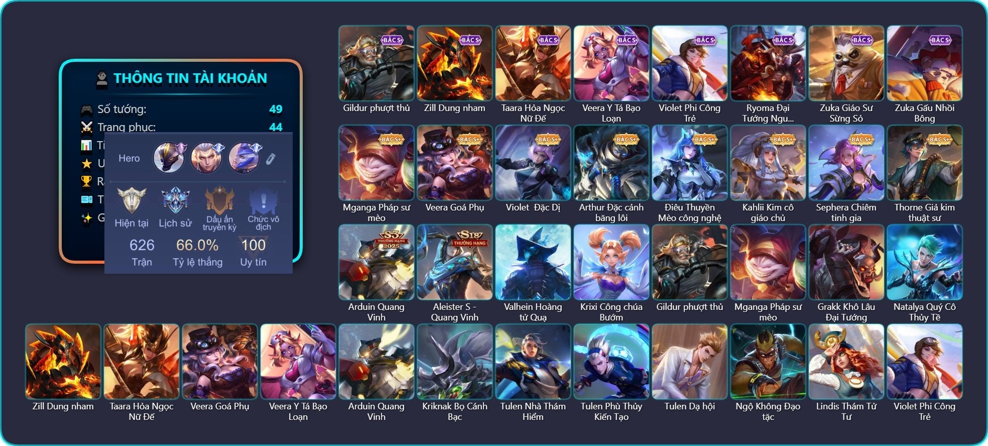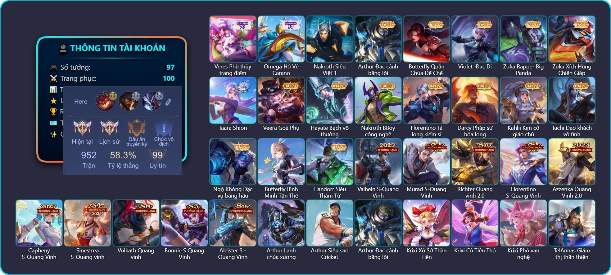 Valhein Hoàng tử Quạ, Valhein Số 7 Thần Sầu, Valhein Khiêu chiến, Valhein Thần tài, Valhein Xạ Thần, Valhein S-Quang Vinh, TelAnnas Giám thị thân thiện, Telannas Dạ hội, TelAnnas Quang Vinh, Arthur Hoàng kim cốt, Arthur Đặc cảnh băng lôi, Krixi Cô Tiên Thỏ, Krixi Phó văn nghệ, Krixi Thuỷ Thủ, Violet Nữ đặc cảnh, Violet Phi Công Trẻ, Violet Đặc Dị, Violet Huy Chương Vàng, Butterfly Teen Nữ Công Nghệ, Butterfly Quận Chúa Đế Chế, Lữ Bố Nam Vương, Lữ Bố Hoả Long Chiến Thần, Zephys Đầu bếp Sashimi, Triệu Vân Quý Công Tử, Triệu Vân Thần Tài, Maloch Ác Ma Địa Ngục, Maloch Samurai Tử Sĩ, Maloch Ác nhân vô tuyến, Veera Goá Phụ, Stuart Vua hề, Stuart Gã hề, Grakk Thuyền Trưởng Râu Đỏ, Grakk Màu cờ sắc áo, Grakk Thần ẩm thực, Ngộ Không Đạo tặc, Ngộ Không Cổ thần Ai Cập, Alice Xứ sở thần tiên, Arum Nữ hoàng gấu xám, Laville Tay đua đường phố, Amily Đặc công nhện đỏ, Amily Hội ám hoàng, Yorn Thế Tử Nguyệt Tộc, Yorn Đặc Nhiệm Swat, Yorn Soái ca bãi biển, Zuka Phát Tài, Zuka Đầu bếp hoàng cung, Zuka Rapper Big Panda, Omen Thuyền trưởng hải tặc, Mina Tiểu thư đoạt hồn, Mina Chị đại lắm chiêu, Gildur Đại gia học viện, Kriknak Bọ Cánh Bạc, Kahlii Siêu đầu bếp, Ata Mèo đi mưa, Ilumia Nữ Chúa Tuyết, Ilumia Diva nổi loạn, Ilumia Ngược dòng thời gian, Azzenka Quang Vinh 2.0, Baldum, Baldum Đồ chơi, Điêu Thuyền Nữ y tá, Taara Hỏa Ngọc Nữ Đế, Marja Linh Xà Tư Tế, Arduin, Arduin Tà linh hiệp sỹ, Omega Cỗ Máy Siêu Tốc, Omega Hộ vệ ba bích, Slimz Lẩu chua cay, Slimz Sứ giả Thiên giới, Thorne Cận vệ hoàng gia, Elandorr Học viện Carano, Lauriel Nữ vương học đường 2, Elsu Mafia, Qi Quán quân, Qi Thiếu nữ mùa xuân, Qi Blogger Ẩm thực, Bright Soái ca thánh điện, Bright Kỳ Lân Soái, Dextra Quý cô Tuổi Dần, Dextra Lữ khách cao nguyên, Airi Kiemono, Airi Đặc công tử điệp, Hayate Bạch lang, Dirak Cảnh Vệ Bầu Trời, Dirak Đường chủ yêu giới, Sephera Quý tiểu thư, Sephera Chiêm tinh gia, Sephera Thủy Liên Hoa, Aya Điệp viên ký ức, Errol Stream đến bao giờ, Xeniel Shipper bánh mỳ, Nakroth BBoy công nghệ, Nakroth Quán quân, Volkath Xung thiên thần tướng, Volkath Tư lệnh viễn chinh, Raz Saitama Cosplay, Richter Dạ hội, Richter Quang vinh 2.0, Roxie Lễ hội hoa, Roxie Hỏa thuật sư, Tulen Phù Thủy Kiến Tạo, Tulen Dạ hội, Enzo Phẩm chất quý tộc, Enzo Thần thoại Hy Lạp, Enzo Leo núi, Capheny Hầu gái, Capheny S-Quang Vinh, Ryoma Dạ hội, Murad Đồ thần đao, Murad S-Quang Vinh, Ignis Bắc băng vương, Florentino Thần thoại Hy Lạp, Florentino Hisoka, Zill Lốc Địa Ngục, Liliana thần tượng âm nhạc, Liliana Thuỷ thủ hồ ly, Rouie Quang Vinh, Fennik Đội đặc nhiệm, Kaine Đôi Cánh Đại Dương, Kaine Người dơi, Yena Hoạt náo viên, Yena Nữ hoàng thể thao, Yena Nữ cướp biển, Max Găng Tay Vàng, Max Chuyên gia đập hộp, Rourke Pháo Thủ Tuộc Neo, Rourke Cuồng tặc, Celica S-Quang Vinh, Celica Tâm hồn trà sữa, Thane Kẻ Hủy Diệt, Thane Mật vụ, Teemee Thịt xiên nướng, Keera Nghệ sĩ Graffiti, Aleister Thiếu Niên Hắc Ám, Aleister Xứ sở thần tiên, Zip Ông trùm giáng sinh, Sinestrea Đại tiểu thư 2