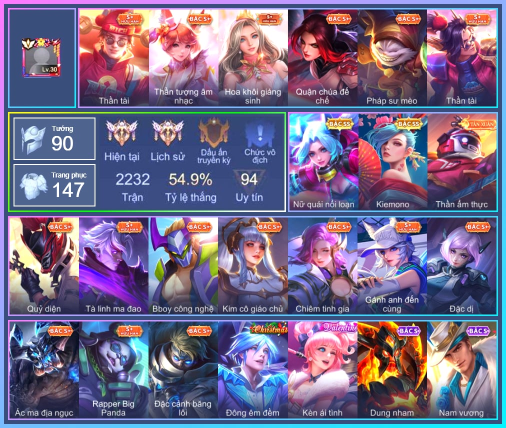 Valhein Hoàng tử Quạ, Valhein Vũ khí tối thượng, Valhein Số 7 Thần Sầu, Triệu Vân Quý Công Tử, Triệu Vân Chiến tướng mùa đông, Krixi Công chúa Bướm, Krixi Phó văn nghệ, Krixi Thuỷ Thủ, Zephys Phi thương, Zephys Tư lệnh viễn chinh, TelAnnas Cảnh Vệ Rừng, Telannas Thánh nữ mật hội, Telannas Dạ hội, TelAnnas Quang Vinh, Toro Đặc cảnh NYPD, Gildur Đại gia học viện, Gildur Đại võ sư, Zip Cá siêu quậy, Zill Lốc Địa Ngục, Zill Dung nham, Zill Thần mộng mị, Zill Phong thần Tu La, Preyta Phi cơ F1, Florentino Vũ kiếm sư, Florentino Giám sát tinh hệ, Florentino Kiếm sĩ Olympic, Florentino S-Quang Vinh, Capheny S-Quang Vinh, Elsu Mafia, Elsu Sứ giả tận thế, Elsu Tuyết ưng, Laville Tay đua đường phố, Laville Tay súng vô địch, Sephera Chiêm tinh gia, Sephera Phi vụ thế kỷ, Mganga Hề cung đình, Mganga Doombot Hủy Diệt, Kahlii Siêu đầu bếp, Kahlii Rối Nước Thuỷ Đình, KilGroth Cảnh Vệ Biển, Aleister Quỷ soái nguyệt tộc, Sinestrea S-Quang vinh, Allain Hạo thiên khuyển, Qi Thiếu nữ mùa xuân, Enzo Chiến binh trăng khuyết, Enzo Thần thoại Hy Lạp, Arthur Hoàng kim cốt, Arthur Siêu sao Cricket, Ignis Bắc băng vương, Quillen Trưởng ngoại khoa, Quillen Huyết phong, Quillen Đảo thiên đường, Nakroth Quân đoàn địa ngục, Nakroth BBoy công nghệ, Nakroth Siêu Việt 1, Yorn Soái ca bãi biển, Taara Hỏa Ngọc Nữ Đế, Butterfly Teen Nữ Công Nghệ, Butterfly Quận Chúa Đế Chế, Butterfly Bình Minh Tận Thế, Thane Kẻ Hủy Diệt, Thane Mật vụ, Thane Khoảnh khắc vinh quang, Zata Sứ giả tinh hệ, Murad M-TP Thần Tượng Học Đường, Murad Điệp viên Anubis, Arum Nữ hoàng gấu xám, Arduin, Arduin Tà linh hiệp sỹ, Natalya Quý Cô Thủy Tề, Airi Đặc công tử điệp, Airi Lễ hội mùa xuân, Zuka Phát Tài, Zuka Gấu Nhồi Bông, Zuka Đầu bếp hoàng cung, Zuka Rapper Big Panda, Zuka Xích Hùng Chiến Giáp, Maloch Ác Ma Địa Ngục, Maloch Samurai Tử Sĩ, Maloch Ác nhân vô tuyến, Grakk Khô Lâu Đại Tướng, Grakk Mèo thần tài, Dirak Quý tộc, Dirak Ông bầu Showbiz, Dirak Đường chủ yêu giới, Violet Huy Chương Vàng, Ngộ Không Đạo tặc, Ngộ Không Ngộ Khá Trẩu, Ngộ Không Nhóc tỳ bá đạo, Ngộ Không Cổ thần Ai Cập, Fennik Nhà thám hiểm, Liliana Thuỷ thủ hồ ly, Moren Anh thợ điện, Skud Sơn Tặc, Lindis Đồng phục Shihakusho, Omen Quỷ nguyệt tướng, Raz Đại tù trưởng, Raz Saitama Cosplay, Điêu Thuyền Nữ y tá, Điêu Thuyền Mèo công nghệ, Paine Công tước máu, Ata Quang vinh, Ata Mèo đi mưa, Richter Quang vinh 2.0, Lauriel Lạc thần, Hayate Bạch lang, Veera Nàng dơi tuyết, Tulen Tân Thần Thiên Hà, Tulen Phù Thủy Kiến Tạo, Tulen Phó kỷ luật, Tulen Dạ hội, Volkath Tư lệnh viễn chinh, Volkath Quang vinh, Amily Hội ám hoàng, Bright Soái ca thánh điện, Aya Điệp viên ký ức, Ybneth Hạt trưởng kiểm lâm, Dextra Quý cô Tuổi Dần, Dextra Đảo thiên đường, Omega Hộ vệ ba bích, Omega Hộ Vệ Carano, Astrid Hoa anh đào, Xeniel Shipper bánh mỳ, Roxie Lễ hội hoa, Roxie Hỏa thuật sư, Rourke Cuồng tặc, Yan nhà chế tác, Annette Xứ sở thần tiên, Azzenka Quang Vinh 2.0, Ilumia Diva nổi loạn, Keera Hồ điệp, Celica S-Quang Vinh, Celica Vịt lướt bọt biển, Iggy Bạch hồ ly, Tachi Đao khách vô tình, Slimz Siêu Cấp Tối Thượng, Kriknak Yêu trùng cổ mộ, Alice Xứ sở thần tiên, Krizzix Crursed Corpse, Max Trà Chanh