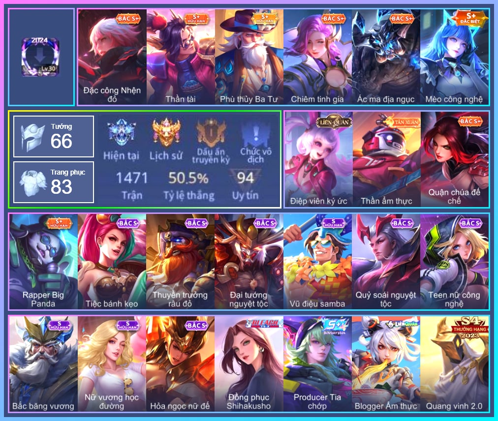 Valhein Hoàng tử Quạ, Valhein Xạ Thần, Valhein S-Quang Vinh, Triệu Vân Quý Công Tử, Triệu Vân Thần Tài, Mina Tiệc Bánh Kẹo, Grakk Thuyền Trưởng Râu Đỏ, Grakk Màu cờ sắc áo, Butterfly Thủy thủ, Butterfly Teen Nữ Công Nghệ, Butterfly Quận Chúa Đế Chế, Maloch Ác Ma Địa Ngục, Maloch Ác nhân vô tuyến, Maloch Đại ca Mukbang, Yorn Thế Tử Nguyệt Tộc, Yorn Soái ca bãi biển, Preyta Không Tặc, Gildur Đại gia học viện, Zephys Phi thương, Lumburr, Arduin, Taara Hỏa Ngọc Nữ Đế, Amily Đặc cảnh NYPD, Amily Hội ám hoàng, Kaine Đôi Cánh Đại Dương, Kaine Người dơi, Kriknak Bọ Cánh Bạc, TelAnnas Cảnh Vệ Rừng, TelAnnas Giám thị thân thiện, TelAnnas Chung Tình Tiễn, Telannas Dạ hội, TelAnnas Quang Vinh, Kahlii Tử điệp, Ilumia Ngược dòng thời gian, Zill Lốc Địa Ngục, Zill Thần mộng mị, Dirak Ông bầu Showbiz, Errol Stream đến bao giờ, Violet Nữ đặc cảnh, Violet Huy Chương Vàng, Qi Tiểu long, Qi Thiếu nữ mùa xuân, Qi Blogger Ẩm thực, Ryoma Dạ hội, Florentino Thần thoại Hy Lạp, Florentino Hisoka, Airi Thích Khách, Richter Dạ hội, Richter Quang vinh 2.0, Liliana Thuỷ thủ hồ ly, Quillen Tà linh ma đao, Ata Mèo đi mưa, Roxie Lễ hội hoa, Elsu Mafia, Capheny Hầu gái, Rouie Quang Vinh, Arthur Si Tình Kiếm, Arthur Siêu sao Cricket, Dextra Chiến binh quyến rũ, Yena Nữ hoàng thể thao, Jinna Dạ xoa vương, Ngộ Không Đạo tặc, Ngộ Không Cổ thần Ai Cập, Murad S-Quang Vinh, Sephera Quý tiểu thư, Zuka Đầu bếp hoàng cung, Zuka Rapper Big Panda, Ignis Bắc băng vương, Fennik Tiệc Bánh Kẹo, Celica Tâm hồn trà sữa, Elandorr Học viện Carano, Thane Mật vụ, Bright Kỳ Lân Soái, Keera Nghệ sĩ Graffiti