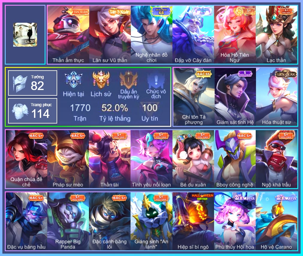 Valhein Hoàng tử Quạ, Valhein Vũ khí tối thượng, Valhein Số 7 Thần Sầu, Valhein Thần tài, Valhein Xạ Thần, Valhein S-Quang Vinh, Triệu Vân Quý Công Tử, Triệu Vân Thần Tài, Krixi Xứ Sở Thần Tiên, Krixi Cô Tiên Thỏ, Krixi Phó văn nghệ, Krixi Thần Thoại Hy Lạp, Krixi Thuỷ Thủ, Krixi Uyên Ương mộng điệp, Gildur phượt thủ, Gildur Đại gia học viện, Gildur Đại võ sư, Azzenka Ghẹo hay kẹo, Azzenka Quang Vinh 2.0, AzzenKa Giáng sinh An lành, Toro Đặc cảnh NYPD, Toro Trung Phong Cắm, Toro Bạch mao Ngưu, Toro Ngưu hải vương, Yorn Cung thủ bóng đêm, Yorn Thế Tử Nguyệt Tộc, Yorn Soái ca học đường, Yorn Lục nguyệt cung, Yorn Soái ca bãi biển, Mganga Hề cung đình, Mganga Pháp sư mèo, Mganga Doombot Hủy Diệt, Mina Tiểu thư đoạt hồn, Mina Tiệc Bánh Kẹo, Mina Đào tạo siêu sao, Taara Đại tù trưởng, Taara Hỏa Ngọc Nữ Đế, Max Hiệp Sĩ Nhí, Max Găng Tay Vàng, Max Quang Vinh, Max Trà Chanh, Veera Goá Phụ, Veera Thiên nga đen, Violet Nữ đặc cảnh, Violet Phó học tập, Violet Đặc Dị, Violet Tay Súng Siêu Phẩm, Violet Huy Chương Vàng, Slimz Thỏ Thợ Mỏ, Slimz Xứ sở thần tiên, Slimz Thỏ nhồi bông, Slimz Lẩu chua cay, Slimz Sứ giả Thiên giới, Slimz Siêu Cấp Tối Thượng, Zephys Phi thương, Zephys Tư lệnh viễn chinh, Zephys Inosuke Hashibira, Zephys Đầu bếp Sashimi, Ryoma Thợ Săn Tiền Thưởng, Ryoma Đại Tướng Nguyệt Tộc, Ryoma Thanh long bang chủ, Ryoma Dạ hội, Qi Thiếu nữ mùa xuân, Qi Blogger Ẩm thực, Grakk Thuyền Trưởng Râu Đỏ, Grakk Khô Lâu Đại Tướng, Grakk Màu cờ sắc áo, Grakk Thần ẩm thực, Kahlii Kim cô giáo chủ, Kahlii Siêu đầu bếp, Kahlii Tử điệp, Kahlii Rối Nước Thuỷ Đình, Moren Anh thợ điện, Elandorr Phi vụ thế kỷ, Elandorr Học viện Carano, Lữ Bố Nam Vương, Lữ Bố Kỵ Sĩ Âm Phủ, TelAnnas Cảnh Vệ Rừng, TelAnnas Giám thị thân thiện, Telannas Thánh nữ mật hội, Telannas Dạ hội, TelAnnas Quang Vinh, Điêu Thuyền Nữ Vương Anh Đào, Điêu Thuyền Nữ y tá, Điêu Thuyền Hoa Hậu, Điêu Thuyền Mèo công nghệ, Điêu Thuyền Tuế Hàn Đỗ Quyên, Natalya Quý Cô Thủy Tề, Natalya Phó nháy nhí nhảnh, Teemee Tay đua siêu tốc, Teemee Thịt xiên nướng, Volkath Dạ Huyết Tộc, Volkath Xung thiên thần tướng, Volkath Tư lệnh viễn chinh, Volkath Quang vinh, Laville Tay đua đường phố, Laville Tay súng diệt thần, Laville Tay súng vô địch, Laville Thám tử học đường, Capheny Hầu gái, Capheny Toán Hóa Sinh, Capheny Siêu cấp tin tặc, Capheny S-Quang Vinh, Rouie Quang Vinh, Yena Khuyên Bạc, Yena Hoạt náo viên, Yena Nữ hoàng thể thao, Yena Nữ cướp biển, Alice Bé Gấu Tuyết, Alice Xứ sở thần tiên, Alice Dạ hội, Alice The Butterfly Mansion Girl, Ignis Hỏa Thuật Sư, Ignis Bắc băng vương, Ignis Nguyệt lão, Ngộ Không Đạo tặc, Ngộ Không Siêu việt, Ngộ Không Nhóc tỳ bá đạo, Ngộ Không Cổ thần Ai Cập, Quillen Trưởng ngoại khoa, Quillen Huyết phong, Preyta Không Tặc, Preyta Băng Hỏa Long Sư, Preyta Phi cơ F1, Dirak Cảnh Vệ Bầu Trời, Dirak Quý tộc, Dirak Ông bầu Showbiz, Dirak Đường chủ yêu giới, Sinestrea Giấc mơ trưa, Sinestrea Đại tiểu thư 2, Sinestrea S-Quang vinh, Sephera Quý tiểu thư, Sephera Phi vụ thế kỷ, Sephera Thủy Liên Hoa, Darcy Pháp sư hỏa long, Aleister Thiếu Niên Hắc Ám, Aleister Quỷ soái nguyệt tộc, Aleister Xứ sở thần tiên, Aleister Không Biết, Aleister Ảo thuật gia, Ilumia Nữ Chúa Tuyết, Ilumia Thiên nữ áo dài, Ilumia Diva nổi loạn, Ilumia Ngược dòng thời gian, Keera Y tá lạ, Keera Học viên Carano, Keera Thuỷ thủ, Keera Nghệ sĩ Graffiti, Keera Hồ điệp, Arthur Hoàng kim cốt, Arthur Si Tình Kiếm, Arthur Siêu sao Cricket, Arthur Đặc cảnh băng lôi, Ybneth Hạt trưởng kiểm lâm, Fennik Nhà thám hiểm, Fennik Đội đặc nhiệm, Fennik Tiệc Bánh Kẹo, Fennik Tay đua F1, Fennik Shipper Siêu thanh, Cresht Thợ sửa cáp, Caesar Bão tố, Lindis Thám Tử Tư, Lindis Dạ tiệc, Lindis Đồng phục Shihakusho, Airi Thích Khách, Airi Kiemono, Airi Đặc công tử điệp, Airi Lễ hội mùa xuân, Bright Soái ca thánh điện, Bright Kỳ Lân Soái, Amily Đặc cảnh NYPD, Amily Đặc công nhện đỏ, Amily Thư ký, Amily Hội ám hoàng, Amily Nữ đội trưởng, Amily Thám tử trung học, Murad Thợ Săn Tiền Thưởng, Murad Đồ thần đao, Murad Thiên Tài Sân Cỏ, Murad S-Quang Vinh, Paine khúc nhạc tử vong, Liliana Hồ Quý Phi, Liliana thần tượng âm nhạc, Liliana Thuỷ thủ hồ ly, Omega Người máy xanh, Omega Cỗ Máy Siêu Tốc, Omega Hộ vệ ba bích, Maloch Ác Ma Địa Ngục, Maloch Samurai Tử Sĩ, Maloch Ác nhân vô tuyến, Maloch Đại ca Mukbang, Astrid Bạch Kiếm Tiểu Thư, Astrid Hoa anh đào, Thane Kẻ Hủy Diệt, Thane Mật vụ, Chaugnar Ác Mộng Sinh Hóa, Zill Lốc Địa Ngục, Zill Thần mộng mị, Arum Thú Vệ Cổ Mộ, Arum Linh tượng vu nữ, Arum Nữ hoàng gấu xám, Arum Thần tượng nhạc Rock, Butterfly Xuân nữ ngổ ngáo, Butterfly Thủy thủ, Butterfly Teen Nữ Công Nghệ, Butterfly Quận Chúa Đế Chế, Butterfly Đông êm đềm, Butterfly Gánh anh đến cùng, Butterfly Bình Minh Tận Thế, Elsu Mafia, Elsu Tuyết ưng, Marja Linh Xà Tư Tế, Baldum chú thợ ống nước, Baldum, Kriknak Bọ Cánh Bạc, Ishar Giấc Mơ Ngọt Ngào, Hayate Bạch ảnh, Hayate Quỷ diện, Hayate Bạch lang, Stuart Gã hề, Zuka Phát Tài, Zuka Đầu bếp hoàng c