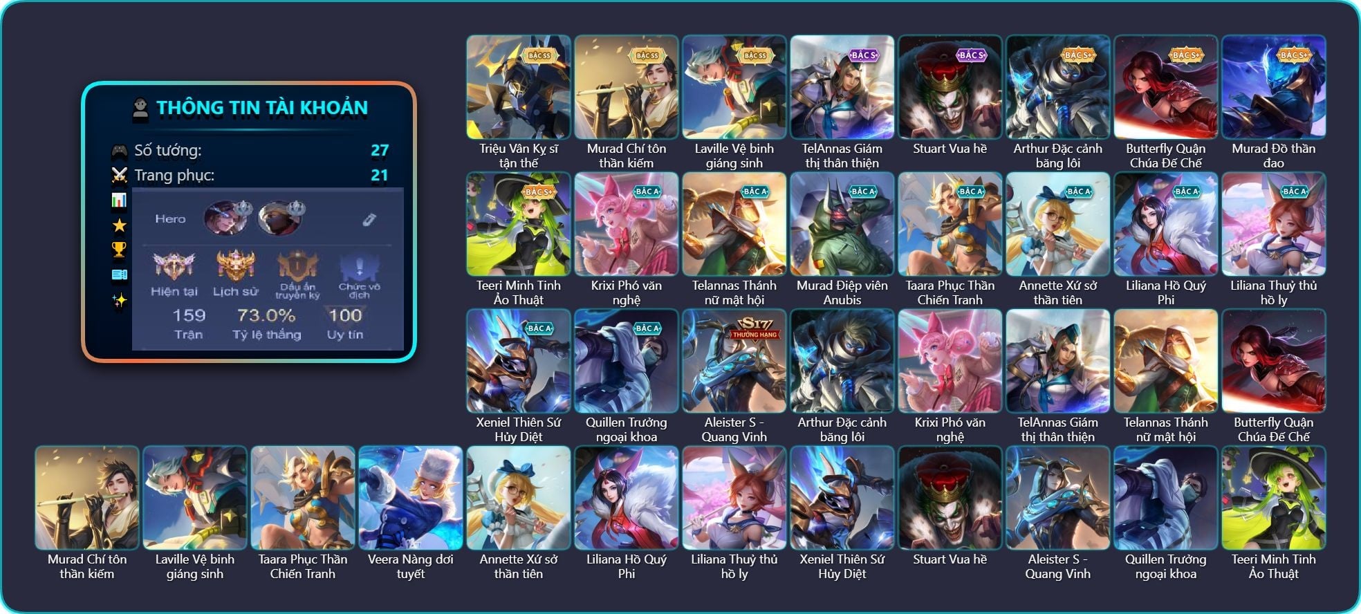 Valhein Hoàng tử Quạ, Valhein Số 7 Thần Sầu, Valhein S-Quang Vinh, Triệu Vân Thần Tài, Krixi Thuỷ Thủ, Veera Goá Phụ, Mganga Doombot Hủy Diệt, Grakk Thuyền Trưởng Râu Đỏ, Grakk Khô Lâu Đại Tướng, Grakk Thần ẩm thực, Lữ Bố Hoả Long Chiến Thần, Maloch Ác nhân vô tuyến, Maloch Đại ca Mukbang, Preyta Không Tặc, Toro Bạch mao Ngưu, Toro Ngưu hải vương, Mina Đào tạo siêu sao, TelAnnas Cảnh Vệ Rừng, TelAnnas Quang Vinh, Murad Thợ Săn Tiền Thưởng, Murad S-Quang Vinh, Arduin, Arduin Tà linh hiệp sỹ, Yorn Soái ca bãi biển, Amily Đặc công nhện đỏ, Amily Hội ám hoàng, Ngộ Không Ngộ Khá Trẩu, Ngộ Không Nhóc tỳ bá đạo, Ngộ Không Cổ thần Ai Cập, Kaine Người dơi, Lindis Đồng phục Shihakusho, Superman Chúa Tể Công Lý, Airi Thích Khách, Dirak Quý tộc, Dirak Đường chủ yêu giới, Violet Nữ đặc cảnh, Violet Tay Súng Siêu Phẩm, Violet Huy Chương Vàng, Hayate Bạch ảnh, Hayate chiến binh trăng khuyết, Điêu Thuyền Nữ Vương Anh Đào, Điêu Thuyền Mèo công nghệ, Slimz Sứ giả Thiên giới, Slimz Siêu Cấp Tối Thượng, Thorne Cận vệ hoàng gia, Allain Lân sư Vũ thần, Volkath Tư lệnh viễn chinh, Volkath Quang vinh, Moren Anh thợ điện, Raz Đại tù trưởng, Qi Thiếu nữ pháo hoa, Sephera Chiêm tinh gia, Ata Mèo đi mưa, Aleister Quỷ soái nguyệt tộc, Veres Đạo tặc, Veres Gián điệp tinh hệ, Veres Chị đại học đường, Roxie Lễ hội hoa, Roxie Hỏa thuật sư, Omega Hộ vệ ba bích, Omega Hộ Vệ Carano, Rouie Quang Vinh, Arthur Lãnh chúa xương, Arthur Siêu sao Cricket, Elandorr Soái tặc, Zill Dung nham, Celica S-Quang Vinh, Ignis Bắc băng vương, Richter Quang vinh 2.0, Tachi Đao khách vô tình, Xeniel Thiên Sứ Hủy Diệt, Zuka Gấu Nhồi Bông, Zuka Đầu bếp hoàng cung, Zuka Rapper Big Panda, Azzenka Quang Vinh 2.0, Sinestrea Lữ khách sa mạc, Sinestrea S-Quang vinh, Enzo Phẩm chất quý tộc, Enzo Leo núi, Ryoma Thợ Săn Tiền Thưởng, Ryoma Ailing Samurai, KilGroth Cảnh Vệ Biển, Bonnie S Quang Vinh