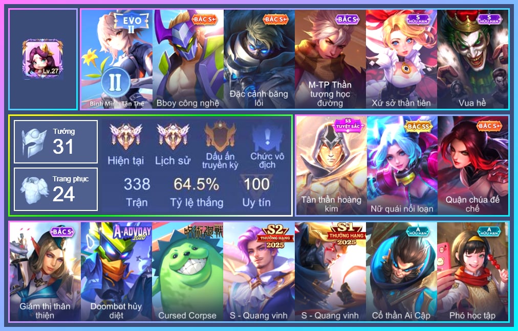 Arthur Đặc cảnh băng lôi, Krixi Phó văn nghệ, TelAnnas Giám thị thân thiện, Tel Annas Jujutsu Sorcerer, Butterfly Quận Chúa Đế Chế, Butterfly Bình Minh Tận Thế, Violet Huy Chương Vàng, Triệu Vân Quý Công Tử, Stuart Vua hề, Kaine Thợ Săn Chính Nghĩa, Sinestrea Đại tiểu thư 1, Ybneth Candy Bear, Omega Hộ Vệ Carano, Florentino Giám sát tinh hệ, Florentino S-Quang Vinh, Enzo Phẩm chất quý tộc, Enzo Hồng hạc thị vệ, KilGroth Cảnh Vệ Biển, Xeniel Kim sí điểu, Liliana Thuỷ thủ hồ ly, Capheny Hầu gái, Errol Vượt ngục, Thorne Giả kim thuật sư, Thorne Thám tử trung học, Kahlii Rối Nước Thuỷ Đình, Mganga Doombot Hủy Diệt, Yorn Soái ca bãi biển, Quillen Trưởng ngoại khoa, Yan nhà chế tác, Zuka Gấu Nhồi Bông, Raz Đại tù trưởng, Nakroth Tiệc Bãi Biển, Bonnie S Quang Vinh, Thane Khoảnh khắc vinh quang, Qi Đặc vụ cáo tuyết, Fennik Phi hành gia, Điêu thuyền Vũ điệu nghê thường, Zephys Đầu bếp Sashimi