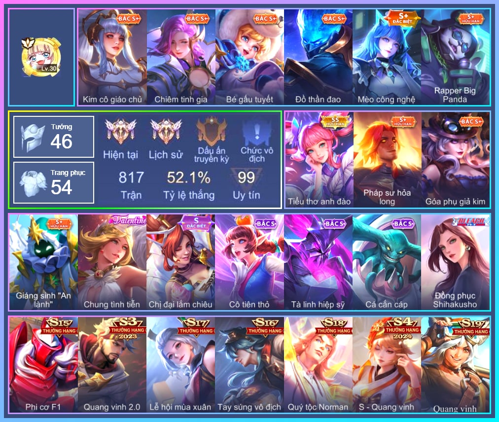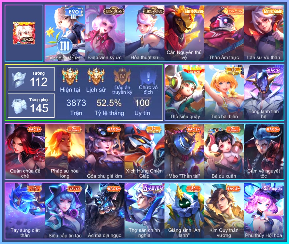 Valhein Hoàng tử Quạ, Valhein S-Quang Vinh, Triệu Vân Quý Công Tử, Triệu Vân Thần Tài, Mina Đào tạo siêu sao, Zephys Siêu việt, Zephys Phi thương, Krixi Cô Tiên Thỏ, Krixi Thuỷ Thủ, Violet Đặc Dị, Violet Huy Chương Vàng, Butterfly Quận Chúa Đế Chế, Butterfly Bình Minh Tận Thế, Murad S-Quang Vinh, Toro Bạch mao Ngưu, Laville Tay đua đường phố, Celica S-Quang Vinh, Errol Stream đến bao giờ, Fennik Nhà thám hiểm, Fennik Tiệc Bánh Kẹo, Fennik Shipper Siêu thanh, Volkath Quang vinh, Capheny S-Quang Vinh, Richter Quang vinh 2.0, Điêu Thuyền Mèo công nghệ, Azzenka Quang Vinh 2.0, Ata Quang vinh, Enzo Leo núi, Max Hiệp Sĩ Nhí, Dirak Ông bầu Showbiz, Aleister Quỷ soái nguyệt tộc, Tachi Đao khách vô tình, Zill Dung nham, Zill Thần mộng mị, Amily Hội ám hoàng, Amily Nữ đội trưởng, Arduin Tà linh hiệp sỹ, Sephera Chiêm tinh gia, Aya Điệp viên ký ức, Lữ Bố Nam Vương, Zuka Đầu bếp hoàng cung, Zuka Rapper Big Panda, Arthur Siêu sao Cricket, Telannas Dạ hội, Slimz Sứ giả Thiên giới, Slimz Siêu Cấp Tối Thượng, Yorn Soái ca bãi biển, Keera Học viên Carano, Keera Hồ điệp, Nakroth Producer Tia chớp, Ignis Bắc băng vương, Xeniel Thiên Sứ Hủy Diệt, Xeniel Shipper bánh mỳ, Grakk Thần ẩm thực, Maloch Samurai Tử Sĩ, Maloch Ác nhân vô tuyến, Maloch Đại ca Mukbang, Roxie Hỏa thuật sư, Sinestrea Lữ khách sa mạc, Sinestrea S-Quang vinh, Dextra Lữ khách cao nguyên, Arum Thần tượng nhạc Rock, Alice The Butterfly Mansion Girl, Quillen Huyết phong, Omega Hộ Vệ Carano