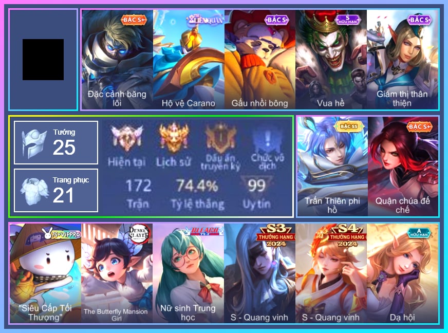 Valhein Hoàng tử Quạ, Valhein Số 7 Thần Sầu, Valhein S-Quang Vinh, TelAnnas Giám thị thân thiện, TelAnnas Chung Tình Tiễn, Telannas Dạ hội, TelAnnas Quang Vinh, Tel Annas Jujutsu Sorcerer, TelAnnas Kỷ Nguyên Hồ Phách, Arthur Siêu sao Cricket, Arthur Đặc cảnh băng lôi, Krixi Xứ Sở Thần Tiên, Krixi Phó văn nghệ, Krixi Thần Thoại Hy Lạp, Krixi Thuỷ Thủ, Violet Phi Công Trẻ, Violet Huy Chương Vàng, Violet Thần long tỷ tỷ, Butterfly Quận Chúa Đế Chế, Butterfly Gánh anh đến cùng, Butterfly Bình Minh Tận Thế, Laville Kim quy thần vương, Allain Lân sư Vũ thần, Triệu Vân Chiến tướng mùa đông, Alice Xứ sở thần tiên, Alice The Butterfly Mansion Girl, Yorn Đặc Nhiệm Swat, Yorn Soái ca bãi biển, Maloch Ác Ma Địa Ngục, Maloch Ác nhân vô tuyến, Stuart Vua hề, Stuart Gã hề, Hayate Bạch lang, Hayate Thống Soái Dạ Ưng, Slimz Thỏ nhồi bông, Toro Ngưu hải vương, Veera Thiên nga đen, Veera Phù thủy Hội họa, Gildur Đại gia học viện, Airi Cấm Vệ Nguyệt Tộc, Airi Kiemono, Dextra Quý cô Tuổi Dần, Ngộ Không Đạo tặc, Ngộ Không Cổ thần Ai Cập, Zuka Đại Phú Ông, Zuka Đầu bếp hoàng cung, Zuka Rapper Big Panda, Zuka Xích Hùng Chiến Giáp, Thorne Giả kim thuật sư, Thorne Ước nguyện giáng sinh, Thorne Thám tử trung học, Florentino Hisoka, Florentino S-Quang Vinh, Qi Thiếu nữ pháo hoa, Qi Blogger Ẩm thực, Nakroth BBoy công nghệ, Nakroth Lôi Quang Sứ, Nakroth Siêu Việt 1, Amily Đặc công nhện đỏ, Amily Thám tử trung học, Arduin Tà linh hiệp sỹ, Sephera Chiêm tinh gia, Ybneth Hạt trưởng kiểm lâm, Ybneth Candy Bear, Raz Saitama Cosplay, Roxie Lễ hội hoa, Zata Thần mặt trời, Yena Nữ hoàng thể thao, Yena Thần Sứ kiều diễm, Elandorr Soái tặc, Zill Thần mộng mị, Zephys Tư lệnh viễn chinh, Zephys Đầu bếp Sashimi, Annette Xứ sở thần tiên, Errol Diệt nguyệt tiên phong, Lauriel Đọa Lạc Thiên Sứ, Lauriel Nữ vương học đường 2, Murad S-Quang Vinh, Capheny Thần tượng âm nhạc, Elsu Mafia, Thane Mật vụ, Thane Khoảnh khắc vinh quang, Kahlii Tử điệp, Kahlii Rối Nước Thuỷ Đình, Ormarr Giáo Viên Thể Hình, Tulen Phó kỷ luật, Kaine Thợ Săn Chính Nghĩa, Richter Quang vinh 2.0, Richter Tổng Lãnh Thiên Thần, Keera Học viên Carano, Aya Điệp viên ký ức, Omen Thuyền trưởng hải tặc, Baldum chú thợ ống nước, Astrid Hoa anh đào, Mganga Hề cung đình, Mganga Pháp sư mèo, Mganga Doombot Hủy Diệt, Tachi S-Vinh Quang, Tachi Đao khách vô tình, Fennik Nhà thám hiểm, Fennik Đội đặc nhiệm, Fennik Tay đua F1, Bright Kỳ Lân Soái, Yue Tiểu công Chúa, Mina Lưỡi hái hoàng kim, Mina Đào tạo siêu sao, Taara Hỏa Ngọc Nữ Đế, Celica Tâm hồn trà sữa, Lumburr, Lumburr Golem thảo nguyên, Teemee Thịt xiên nướng, Teemee Giấc Mơ Ngọt Ngào, Liliana thần tượng âm nhạc, Ignis Bắc băng vương, Ignis Nguyệt lão, Ignis Vì sao con khóc, Xeniel Thiên Sứ Hủy Diệt, Azzenka Quang Vinh 2.0, AzzenKa Giáng sinh An lành, Paine khúc nhạc tử vong, Sinestrea Lữ khách sa mạc, Sinestrea S-Quang vinh, Aleister Xứ sở thần tiên, Điêu Thuyền Mèo công nghệ, Rouie Mèo hầu gái, Dirak Cảnh Vệ Bầu Trời, Dirak Đường chủ yêu giới, Omega Hộ Vệ Carano, Iggy Bạch hồ ly, Iggy Tiếng thét Hỗn mang, Darcy Pháp sư hỏa long, Lữ Bố Nam Vương, Ilumia Nữ Chúa Tuyết, Ilumia Thiên nữ áo dài, Dolia Môn đồ tập sự, Volkath Xung thiên thần tướng, Volkath Quang vinh, Veres Thần thoại Hy Lạp, Caesar Bão tố, Max Trà Chanh, KilGroth Càn Nguyên Thủ Vệ, Ata Tân thủy thủ, Krizzix Crursed Corpse, Zip Gà siêu quậy, Rourke Thánh Vệ, Bonnie S Quang Vinh, Marja Linh Xà Tư Tế, Moren Lính cứu hỏa, Ishar Quận chúa sông Nile, Ishar Capoo Boom