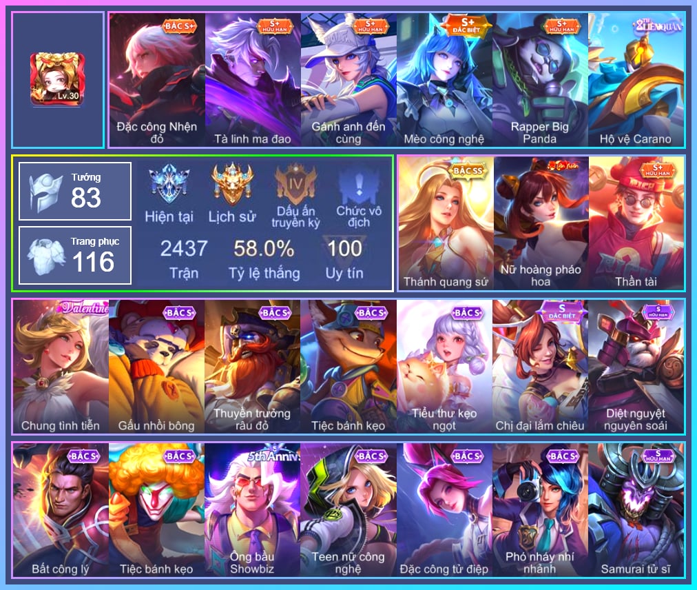 Valhein Hoàng tử Quạ, Valhein Số 7 Thần Sầu, Valhein S-Quang Vinh, Triệu Vân Quý Công Tử, Gildur phượt thủ, Gildur Đại gia học viện, Krixi Thuỷ Thủ, TelAnnas Cảnh Vệ Rừng, TelAnnas Chung Tình Tiễn, Telannas Dạ hội, TelAnnas Quang Vinh, Toro Trung Phong Cắm, Toro Bạch mao Ngưu, Nakroth Siêu Việt 1, Darcy Pháp sư hỏa long, Alice Dạ hội, Zuka Đại Phú Ông, Zuka Phát Tài, Zuka Gấu Nhồi Bông, Zuka Đầu bếp hoàng cung, Zuka Xích Hùng Chiến Giáp, Preyta Phi cơ F1, Omen Ám tử đao, Điêu Thuyền Mèo công nghệ, Kriknak Bọ Cánh Bạc, Yorn Cung thủ bóng đêm, Kahlii Siêu đầu bếp, Kahlii Rối Nước Thuỷ Đình, Zephys Oán linh, Zephys Phi thương, Zephys Đầu bếp Sashimi, Zill Dung nham, Lữ Bố Hoả Long Chiến Thần, Lữ Bố Vũ điệu Samba, Mina Tiệc Bánh Kẹo, Murad Thợ Săn Tiền Thưởng, Murad Thiên Tài Sân Cỏ, Murad S-Quang Vinh, Capheny Siêu cấp tin tặc, Capheny S-Quang Vinh, Errol Vượt ngục, Errol Huyết thủ Tu La, Laville Tay súng vô địch, Raz Đại tù trưởng, Butterfly Thủy thủ, Butterfly Teen Nữ Công Nghệ, Butterfly Quận Chúa Đế Chế, Butterfly Đông êm đềm, Butterfly Gánh anh đến cùng, Butterfly Bình Minh Tận Thế, Arthur Siêu sao Cricket, Sephera Phi vụ thế kỷ, Sephera Thủy Liên Hoa, KilGroth Cảnh Vệ Biển, Veera Goá Phụ, Grakk Thuyền Trưởng Râu Đỏ, Mganga Doombot Hủy Diệt, Kaine Thợ Săn Chính Nghĩa, Enzo Phẩm chất quý tộc, Enzo Thần thoại Hy Lạp, Airi Thích Khách, Airi Ninja Xanh Lá, Airi Đặc công tử điệp, Airi Lễ hội mùa xuân, Ngộ Không Đạo tặc, Ngộ Không Nhóc tỳ bá đạo, Ngộ Không Cổ thần Ai Cập, Florentino SEVEN, Florentino S-Quang Vinh, Elandorr Phi vụ thế kỷ, Elandorr Học viện Carano, Omega Hộ vệ ba bích, Violet Nữ đặc cảnh, Violet Phó học tập, Violet Đặc Dị, Violet Tay Súng Siêu Phẩm, Violet Huy Chương Vàng, Maloch Ác Ma Địa Ngục, Maloch Samurai Tử Sĩ, Maloch Ác nhân vô tuyến, Paine khúc nhạc tử vong, Qi Thiếu nữ pháo hoa, Qi Blogger Ẩm thực, Bright Soái ca thánh điện, Hayate Bạch lang, Yena Hoạt náo viên, Yena Nữ cướp biển, Lauriel Đọa Lạc Thiên Sứ, Dirak Quý tộc, Amily Hội ám hoàng, Amily Thám tử trung học, Aleister Thiếu Niên Hắc Ám, Aleister Xứ sở thần tiên, Volkath Quang vinh, Ata Quang vinh, Ata Mèo đi mưa, Elsu Mafia, Max Tiểu King Kong, Max Trà Chanh, Tulen Phù Thủy Kiến Tạo, Natalya Quý Cô Thủy Tề, Lindis Đồng phục Shihakusho, Thorne Thám tử trung học, Thane Khoảnh khắc vinh quang, Roxie Lễ hội hoa, Wisp Ếch nhồi bông, Wisp Rồng đi bộ, Dextra Lữ khách cao nguyên, Fennik Nhà thám hiểm, Fennik Tay đua F1, Rourke Cuồng tặc, Yan nhà chế tác, Veres Đạo tặc, Slimz Thỏ nhồi bông, Keera Y tá lạ, Keera Hồ điệp, Baldum Đồ chơi, Rouie Quang Vinh, Celica S-Quang Vinh, Liliana thần tượng âm nhạc, Liliana Thuỷ thủ hồ ly, Stuart Gã hề, Arduin, Xeniel Shipper bánh mỳ, Ryoma Dạ hội, Ryoma Ailing Samurai, Iggy Bạch hồ ly, Ignis Vì sao con khóc, Bonnie S Quang Vinh, Ybneth Candy Bear, Ishar Capoo Boom