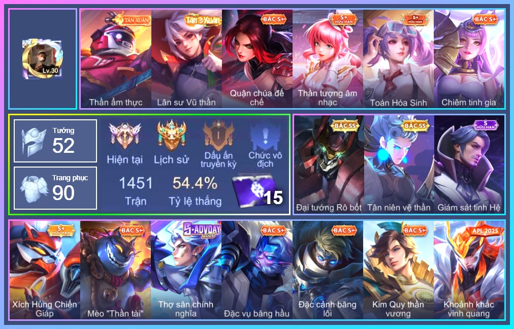 Arthur Hoàng kim cốt, Arthur Đặc cảnh băng lôi, Krixi Xứ Sở Thần Tiên, Krixi Phó văn nghệ, Krixi Thuỷ Thủ, TelAnnas Giám thị thân thiện, Telannas Dạ hội, Ryoma Thanh long bang chủ, Ryoma Dạ hội, Florentino Giám sát tinh hệ, Florentino Kiếm sĩ Olympic, Florentino Thần thoại Hy Lạp, Florentino Hisoka, Florentino S-Quang Vinh, Butterfly Quận Chúa Đế Chế, Butterfly Bình Minh Tận Thế, Violet Huy Chương Vàng, Bright Khiêu chiến, Gildur Thuyền trưởng râu bạc, Alice Dạ hội, Alice The Butterfly Mansion Girl, Yorn Đặc Nhiệm Swat, Laville Kim quy thần vương, Natalya Quý Cô Thủy Tề, Azzenka Quang Vinh 2.0, Triệu Vân Quý Công Tử, Triệu Vân Dũng Sĩ Đồ Long, Allain Lân sư Vũ thần, Maloch Tiệc hóa trang, Maloch Samurai Tử Sĩ, Maloch Đại Tướng Robot, Maloch Ác nhân vô tuyến, Veera Cô giáo hắc ám, Ngộ Không Đạo tặc, Ngộ Không Đặc vụ băng hầu, Ngộ Không Cổ thần Ai Cập, Grakk Thuyền Trưởng Râu Đỏ, Grakk Mèo thần tài, Grakk Thần ẩm thực, Stuart Vua hề, Mganga Doombot Hủy Diệt, Toro Bạch mao Ngưu, Toro Ngưu hải vương, Capheny Toán Hóa Sinh, Capheny S-Quang Vinh, Elsu Cảnh vệ thảo nguyên, Elsu Chiến binh bóng tối, Elsu Tuyết ưng, Murad M-TP Thần Tượng Học Đường, Dextra Lữ khách cao nguyên, Keera Hồ điệp, Xeniel Shipper bánh mỳ, Enzo Phẩm chất quý tộc, Enzo Chiến binh trăng khuyết, Enzo Thần thoại Hy Lạp, Enzo Leo núi, Baldum Đồ chơi, Raz Đại tù trưởng, Celica S-Quang Vinh, Nakroth Producer Tia chớp, Nakroth Siêu Việt 1, Tachi Đao khách vô tình, Slimz Siêu Cấp Tối Thượng, Tulen Tân niên vệ thần, Quillen Huyết phong, Paine khúc nhạc tử vong, Taara Hỏa Ngọc Nữ Đế, Sinestrea S-Quang vinh, Thane Kẻ Hủy Diệt, Thane Khoảnh khắc vinh quang, Omega Hộ Vệ Carano, Max Hiệp Sĩ Nhí, Max Tiểu King Kong, Max Trà Chanh, Volkath Quang vinh, Airi Đặc công tử điệp, Zuka Gấu Nhồi Bông, Zuka Xích Hùng Chiến Giáp, KilGroth Cảnh Vệ Biển, Omen Chiến binh trăng khuyết, Caesar Bão tố, Bonnie S Quang Vinh, Kaine Thợ Săn Chính Nghĩa, Yue Chiêm Tinh gia, Annette Thần tượng âm nhạc, Ormarr CĐV Cuồng nhiệt, Iggy Bạch hồ ly, Amily Thám tử trung học, Thorne Thám tử trung học, Ignis Vì sao con khóc