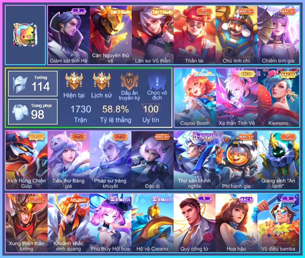 Arthur Siêu sao Cricket, Arthur Đặc cảnh băng lôi, Krixi Xứ Sở Thần Tiên, Krixi Phó văn nghệ, Krixi Thuỷ Thủ, TelAnnas Giám thị thân thiện, TelAnnas Chung Tình Tiễn, Telannas Thánh nữ mật hội, Telannas Dạ hội, Valhein Hoàng tử Quạ, Valhein Số 7 Thần Sầu, Valhein Khiêu chiến, Butterfly Quận Chúa Đế Chế, Butterfly Bình Minh Tận Thế, Violet Huy Chương Vàng, Omen Sĩ Quan Viễn Chinh, Omen Chiến binh trăng khuyết, Natalya Quý Cô Thủy Tề, Triệu Vân Quý Công Tử, Lauriel Nữ vương học đường 2, Allain Lân sư Vũ thần, Maloch Ác nhân vô tuyến, Veera Thiên nga đen, Veera Phù thủy Hội họa, Lữ Bố Hoả Long Chiến Thần, Lữ Bố Vũ điệu Samba, Stuart Vua hề, Grakk Thuyền Trưởng Râu Đỏ, Alice Dạ hội, Alice The Butterfly Mansion Girl, Capheny S-Quang Vinh, Raz Đại tù trưởng, Zuka Gấu Nhồi Bông, Zuka Đầu bếp hoàng cung, Zuka Rapper Big Panda, Aleister Thiếu Niên Hắc Ám, Ilumia Nữ Chúa Tuyết, Ilumia Ngược dòng thời gian, AzzenKa Giáng sinh An lành, Amily Khủng long xanh, Amily Thám tử trung học, Zephys Tư lệnh viễn chinh, Laville Kim quy thần vương, Nakroth BBoy công nghệ, Nakroth Siêu Việt 1, Yan nhà chế tác, Liliana thần tượng âm nhạc, Yorn Đặc Nhiệm Swat, Điêu thuyền Vũ điệu nghê thường, Ngộ Không Đặc vụ băng hầu, Ngộ Không Cổ thần Ai Cập, Murad Điệp viên Anubis, Murad S-Quang Vinh, Xeniel Thiên Sứ Hủy Diệt, Xeniel Shipper bánh mỳ, Kahlii Siêu đầu bếp, Errol Vượt ngục, Keera Nghệ sĩ Graffiti, Kaine Thợ Săn Chính Nghĩa, Richter Quang vinh 2.0, Roxie Hỏa thuật sư, Bright Soái ca thánh điện, Zill Thần mộng mị, Yena Nữ hoàng thể thao, Dextra Chiến binh quyến rũ, Dextra Lữ khách cao nguyên, Tulen Tân Thần Thiên Hà, Hayate Bạch ảnh, Hayate Bạch lang, Gildur Đại gia học viện, Ryoma Ailing Samurai, Taara Tư lệnh hải âu, Celica S-Quang Vinh, Qi Đặc vụ cáo tuyết, Florentino Thần thoại Hy Lạp, Florentino S-Quang Vinh, Tachi Đao khách vô tình, Dolia Môn đồ tập sự, Sinestrea S-Quang vinh, Omega Hộ Vệ Carano, Ybneth Candy Bear, Mganga Doombot Hủy Diệt, Max Hiệp Sĩ Nhí, Thorne Ước nguyện giáng sinh, Volkath Xung thiên thần tướng, Thane Khoảnh khắc vinh quang, Ming thầy tướng, KilGroth Cảnh Vệ Biển, Enzo Phẩm chất quý tộc, Bonnie S Quang Vinh, Paine khúc nhạc tử vong, Annette Xứ sở thần tiên, Mina Tiểu thư đoạt hồn, Slimz Sứ giả Thiên giới, Ignis Vì sao con khóc