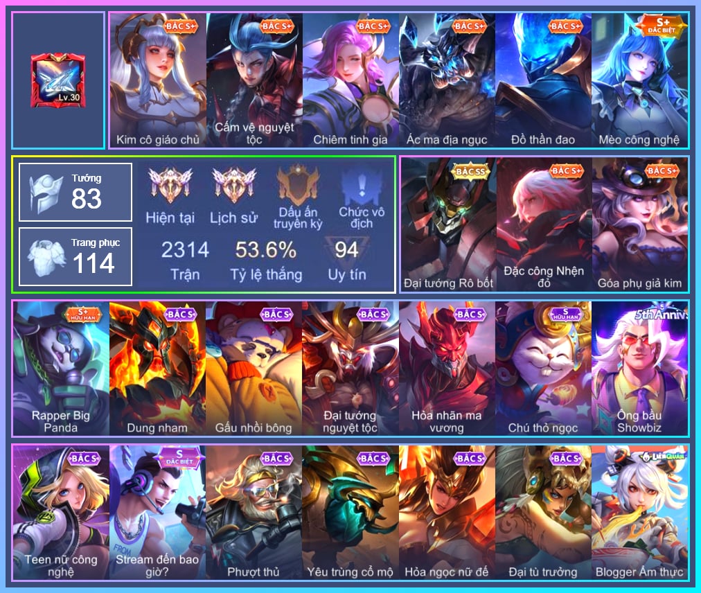 Valhein Hoàng tử Quạ, Valhein Xạ Thần, Valhein S-Quang Vinh, Krixi Phó văn nghệ, Krixi Thuỷ Thủ, Butterfly Teen Nữ Công Nghệ, Butterfly Bình Minh Tận Thế, Kahlii Kim cô giáo chủ, Kahlii Rối Nước Thuỷ Đình, KilGroth Cảnh Vệ Biển, Taara Đại tù trưởng, Taara Hỏa Ngọc Nữ Đế, Taara Tư lệnh hải âu, Maloch Ác Ma Địa Ngục, Maloch Đại Tướng Robot, Grakk Màu cờ sắc áo, Alice Nhà chiêm tinh, Gildur phượt thủ, Skud Quang Vinh, Astrid Bạch Kiếm Tiểu Thư, Astrid Hoa anh đào, Violet Nữ đặc cảnh, Violet Phó học tập, Violet Huy Chương Vàng, Airi Cấm Vệ Nguyệt Tộc, Airi Lễ hội mùa xuân, Lindis Thám Tử Tư, Lindis Quang Vinh, Zuka Đại Phú Ông, Zuka Gấu Nhồi Bông, Zuka Đầu bếp hoàng cung, Zuka Rapper Big Panda, Arduin, Tulen Phó kỷ luật, Yorn Soái ca bãi biển, Natalya Quý Cô Thủy Tề, Ignis Quang Vinh, Veera Goá Phụ, Điêu thuyền Vũ điệu nghê thường, Điêu Thuyền Mèo công nghệ, Jinna Hỏa nhãn ma vương, Slimz Chú thỏ ngọc, Marja Linh Xà Tư Tế, Murad Đồ thần đao, Murad S-Quang Vinh, Max Quang Vinh, Xeniel Thiên Sứ Hủy Diệt, Xeniel Kim sí điểu, Dirak Quý tộc, Dirak Ông bầu Showbiz, Ishar Giấc Mơ Ngọt Ngào, Telannas Thánh nữ mật hội, Telannas Dạ hội, TelAnnas Quang Vinh, Elandorr Học viện Carano, Errol Vượt ngục, Errol Stream đến bao giờ, Volkath Quang vinh, Qi Tiểu long, Qi Thiếu nữ pháo hoa, Qi Blogger Ẩm thực, Enzo Thần thoại Hy Lạp, Enzo Leo núi, Florentino Vũ kiếm sư, Florentino Kiếm sĩ Olympic, Florentino Thần thoại Hy Lạp, Florentino S-Quang Vinh, Richter Quang vinh 2.0, Capheny Hầu gái, Zill Dung nham, Zill Thần mộng mị, Zephys Phi thương, Zephys Tư lệnh viễn chinh, Laville Tay đua đường phố, Laville Tay súng vô địch, Omega Người máy xanh, Sinestrea S-Quang vinh, Raz Đại tù trưởng, Hayate Bạch ảnh, Hayate Bạch lang, Kriknak Bọ Cánh Bạc, Kriknak Yêu trùng cổ mộ, Ryoma Thợ Săn Tiền Thưởng, Ryoma Đại Tướng Nguyệt Tộc, Ryoma Dạ hội, Ata Quang vinh, Quillen Trưởng ngoại khoa, Sephera Chiêm tinh gia, Sephera Thủy Liên Hoa, Tachi Đao khách vô tình, Amily Đặc cảnh NYPD, Amily Đặc công nhện đỏ, Amily Hội ám hoàng, Amily Nữ đội trưởng, Arum Nữ hoàng gấu xám, Lumburr Golem thảo nguyên, Arthur Hoàng kim cốt, Arthur Siêu sao Cricket, Krizzix Crursed Corpse, Roxie Lễ hội hoa, Aleister Thiếu Niên Hắc Ám, Rouie Quang Vinh, Fennik Tay đua F1, Fennik Shipper Siêu thanh, Liliana Hồ Quý Phi, Liliana Thuỷ thủ hồ ly, Bright Kỳ Lân Soái, Thorne Cận vệ hoàng gia, Ngộ Không Đạo tặc, Ngộ Không Cổ thần Ai Cập, Annette Xứ sở thần tiên, Celica S-Quang Vinh, Omen Sĩ Quan Viễn Chinh, Omen Thuyền trưởng hải tặc