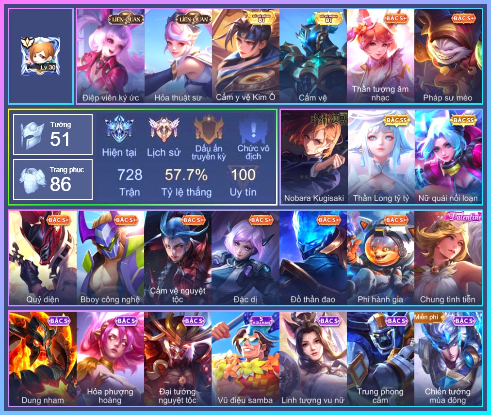 Valhein Hoàng tử Quạ, Valhein Xạ Thần, Triệu Vân Chiến tướng mùa đông, Krixi Phó văn nghệ, Mina Đào tạo siêu sao, Mina Cẩm y vệ Kim Ô, Toro Trung Phong Cắm, Mganga Hề cung đình, Mganga Pháp sư mèo, Kahlii Siêu đầu bếp, Alice Xứ sở thần tiên, TelAnnas Chung Tình Tiễn, Telannas Thánh nữ mật hội, Telannas Dạ hội, Tel Annas Jujutsu Sorcerer, Gildur Đại gia học viện, Veera Bách hoa tiên nữ, Tulen Nhà Thám Hiểm, Ignis Hỏa Thuật Sư, Ignis Quang Vinh, Ignis Bắc băng vương, Zephys Tư lệnh viễn chinh, Zephys Đầu bếp Sashimi, Butterfly Nữ Quái Nổi Loạn, Marja Linh Xà Tư Tế, Violet Phó học tập, Violet Đặc Dị, Violet Tay Súng Siêu Phẩm, Violet Huy Chương Vàng, Violet Thần long tỷ tỷ, Violet Nobara Kugisaki, Lauriel Đọa Lạc Thiên Sứ, Lauriel Hỏa Phượng Hoàng, Preyta Phi cơ F1, Arthur Siêu sao Cricket, Airi Quái xế công nghệ, Airi Cấm Vệ Nguyệt Tộc, Arduin Quang Vinh, Maloch Ác nhân vô tuyến, Maloch Đại ca Mukbang, Ngộ Không Cổ thần Ai Cập, Annette Nữ quản ga, Lindis Thám Tử Tư, Lindis Quang Vinh, Xeniel Thiên Sứ Hủy Diệt, Xeniel Cẩm vệ, Elsu Mafia, Hayate Bạch ảnh, Hayate Quỷ diện, Điêu Thuyền Nữ Vương Anh Đào, Fennik Nhà thám hiểm, Fennik Phi hành gia, Lữ Bố Kỵ Sĩ Âm Phủ, Lữ Bố Vũ điệu Samba, Quillen Trưởng ngoại khoa, Ryoma Đại Tướng Nguyệt Tộc, Ryoma Dạ hội, Max Quang Vinh, Teemee Tay đua siêu tốc, Wisp Rồng đi bộ, Slimz Lẩu chua cay, Slimz Sứ giả Thiên giới, Zill Dung nham, Richter Quang vinh 2.0, Azzenka Quang Vinh 2.0, Roxie Cháy Phố, Roxie Hỏa thuật sư, Aya Điệp viên ký ức, Baldum Đồ chơi, Bright Soái ca thánh điện, Sinestrea Lữ khách sa mạc, Liliana Hồ Quý Phi, Liliana thần tượng âm nhạc, Capheny Hầu gái, Capheny S-Quang Vinh, Raz Đại tù trưởng, Raz Saitama Cosplay, Raz MC Võ đài, KilGroth Cảnh Vệ Biển, Laville Tay đua đường phố, Murad Đồ thần đao, Ybneth Candy Bear, Bonnie S Quang Vinh, Arum Linh tượng vu nữ, Lorion Chiến giáp hắc ám, Nakroth BBoy công nghệ