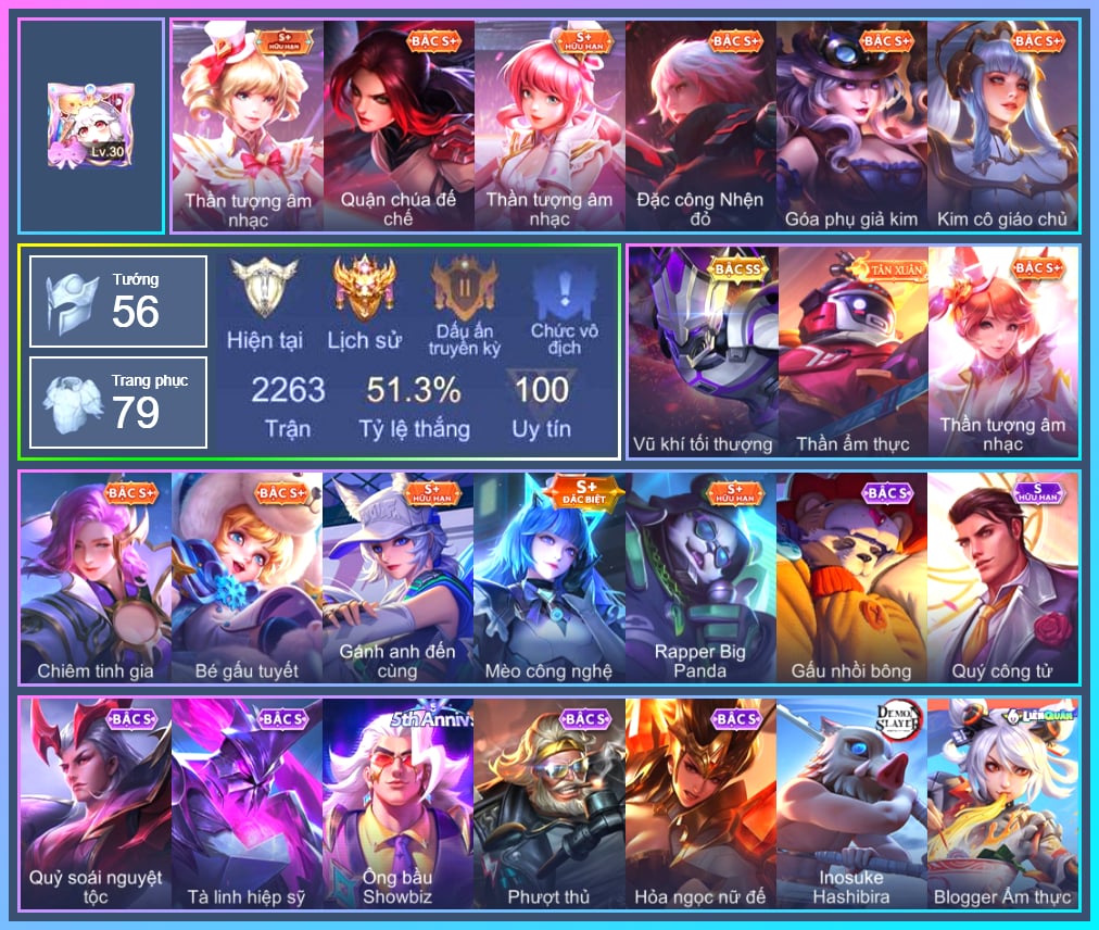 Valhein Hoàng tử Quạ, Valhein Vũ khí tối thượng, Valhein Số 7 Thần Sầu, Valhein Xạ Thần, Valhein S-Quang Vinh, Triệu Vân Quý Công Tử, Krixi Thuỷ Thủ, Taara Hỏa Ngọc Nữ Đế, Mina Đào tạo siêu sao, Gildur phượt thủ, Gildur Đại gia học viện, Mganga Hề cung đình, Kahlii Kim cô giáo chủ, Lindis Quang Vinh, Zuka Phát Tài, Zuka Gấu Nhồi Bông, Zuka Rapper Big Panda, Xeniel Thiên Sứ Hủy Diệt, Xeniel Kim sí điểu, Kaine Người dơi, TelAnnas Cảnh Vệ Rừng, Telannas Dạ hội, TelAnnas Quang Vinh, Lauriel Đọa Lạc Thiên Sứ, TeeMee Xiếc Cung Đình, Teemee Tay đua siêu tốc, Max Quang Vinh, Max Chuyên gia đập hộp, Arduin, Arduin Quang Vinh, Arduin Tà linh hiệp sỹ, Violet Tay Súng Siêu Phẩm, Violet Huy Chương Vàng, Preyta Phi cơ F1, Murad S-Quang Vinh, Laville Tay súng vô địch, Laville Sắc màu Holi, Điêu Thuyền Mèo công nghệ, Elsu Mafia, Elandorr Học viện Carano, Butterfly Quận Chúa Đế Chế, Butterfly Gánh anh đến cùng, Zephys Tư lệnh viễn chinh, Zephys Inosuke Hashibira, Zata Tư lệnh viễn chinh, Alice Bé Gấu Tuyết, Capheny Hầu gái, Capheny Thần tượng âm nhạc, Capheny S-Quang Vinh, Ilumia Diva nổi loạn, Veera Goá Phụ, Ata Quang vinh, Amily Đặc công nhện đỏ, Amily Hội ám hoàng, Dextra Lữ khách cao nguyên, Thorne Cận vệ hoàng gia, Dirak Ông bầu Showbiz, Raz Đại tù trưởng, Raz Saitama Cosplay, Sephera Quý tiểu thư, Sephera Chiêm tinh gia, Aleister Quỷ soái nguyệt tộc, Qi Thiếu nữ pháo hoa, Qi Blogger Ẩm thực, Roxie Lễ hội hoa, Omega Hộ vệ ba bích, Zill Thần mộng mị, Ngộ Không Cổ thần Ai Cập, Annette Xứ sở thần tiên, Annette Thần tượng âm nhạc, Liliana thần tượng âm nhạc, Rouie Quang Vinh, Enzo Leo núi, Grakk Màu cờ sắc áo, Grakk Thần ẩm thực, Richter Quang vinh 2.0, Arthur Siêu sao Cricket, Quillen Trưởng ngoại khoa, Azzenka Quang Vinh 2.0