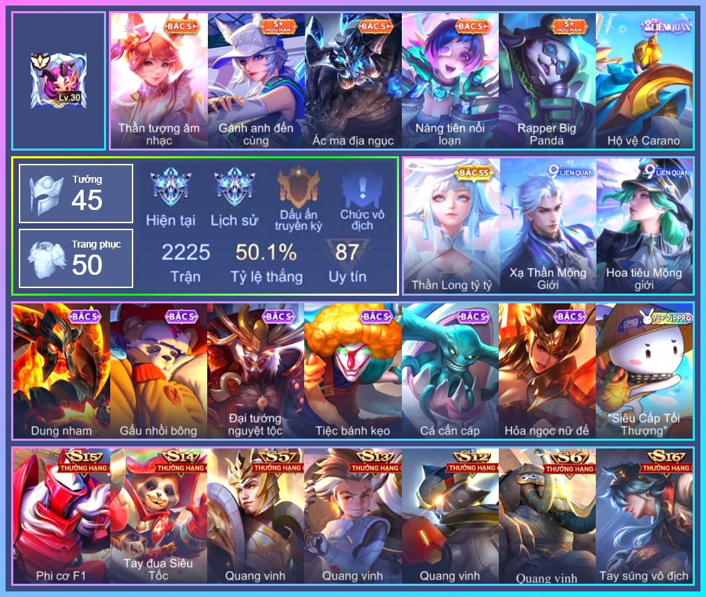 TelAnnas Giám thị thân thiện, Telannas Dạ hội, TelAnnas Quang Vinh, Valhein Hoàng tử Quạ, Valhein Xạ Thần, Valhein S-Quang Vinh, Arthur Hoàng kim cốt, Arthur Đặc cảnh băng lôi, Butterfly Teen Nữ Công Nghệ, Butterfly Quận Chúa Đế Chế, Amily Đặc công nhện đỏ, Amily Nữ đội trưởng, Natalya Nghệ nhân lân, Natalya Phó nháy nhí nhảnh, Violet Nữ đặc cảnh, Violet Phi Công Trẻ, Violet Đặc Dị, Gildur phượt thủ, Gildur Đại gia học viện, Zephys Phi thương, Krixi Thuỷ Thủ, Wisp Ếch nhồi bông, Triệu Vân Quý Công Tử, Triệu Vân Thần Tài, Omen Thuyền trưởng hải tặc, Maloch Ác Ma Địa Ngục, Maloch Ác nhân vô tuyến, Veera Nàng dơi tuyết, Veera Thiên nga đen, Lữ Bố Nam Vương, Lữ Bố Kỵ Sĩ Âm Phủ, Stuart Trò đùa tử vong, Stuart Vua hề, Grakk Thuyền Trưởng Râu Đỏ, Grakk Khô Lâu Đại Tướng, Grakk Màu cờ sắc áo, Grakk Thần ẩm thực, Alice Xứ sở thần tiên, Alice Dạ hội, Alice The Butterfly Mansion Girl, Toro Đặc cảnh NYPD, Zuka Phát Tài, Zuka Đầu bếp hoàng cung, Zuka Rapper Big Panda, Ngộ Không Đạo tặc, Ngộ Không Cổ thần Ai Cập, Kriknak Bọ Cánh Bạc, Mina Đào tạo siêu sao, Marja Linh Xà Tư Tế, Kahlii Siêu đầu bếp, Kahlii Tử điệp, Yorn Lục nguyệt cung, Yorn Soái ca bãi biển, Sephera Quý tiểu thư, Sephera Chiêm tinh gia, Sephera Thủy Liên Hoa, Kaine Người dơi, Raz Đại tù trưởng, Raz Băng Quyền Quán Quân, Roxie Lễ hội hoa, Ata Mèo đi mưa, Florentino Vũ kiếm sư, Taara Hỏa Ngọc Nữ Đế, Veres Đạo tặc, Veres Chị đại học đường, Arduin, Arduin Tà linh hiệp sỹ, Bright Soái ca thánh điện, Bright Kỳ Lân Soái, Richter Dạ hội, Richter Quang vinh 2.0, Zata Tư lệnh viễn chinh, Airi Thích Khách, Airi Đặc công tử điệp, Errol Stream đến bao giờ, Rourke Cuồng tặc, Zill Lốc Địa Ngục, Zill Thần mộng mị, Slimz Sứ giả Thiên giới, Nakroth BBoy công nghệ, Omega Hộ vệ ba bích, Tulen Phù Thủy Kiến Tạo, Tulen Dạ hội, Ybneth Hạt trưởng kiểm lâm, YBneth Chiến binh lục bảo, Elandorr Phi vụ thế kỷ, Laville Tay đua đường phố, Laville Kim quy thần vương, Hayate Bạch ảnh, Hayate Ngân lang, Hayate Bạch lang, Elsu Mafia, Lauriel Đọa Lạc Thiên Sứ, Lauriel Nữ vương học đường 2, Rouie Quang Vinh, Liliana thần tượng âm nhạc, Liliana Nguyệt mị ly, Điêu Thuyền Nữ Vương Anh Đào, Celica S-Quang Vinh, Qi Blogger Ẩm thực, Quillen Sao đỏ học đường, Quillen Người gác đền, Fennik Nhà thám hiểm, Fennik Đội đặc nhiệm, Fennik Tiệc Bánh Kẹo, Fennik Tay đua F1, Fennik Shipper Siêu thanh, Murad Thợ Săn Tiền Thưởng, Murad S-Quang Vinh, Enzo Thần thoại Hy Lạp, Enzo Leo núi, Aoi Sát Thủ Đô Thị, Aya Hoạt náo viên, Capheny S-Quang Vinh, Yena Hoạt náo viên, Yena Nữ cướp biển, Yena Hoa tiêu Mộng giới, Zip Gà siêu quậy, Zip Vua sân cỏ, Paine khúc nhạc tử vong, Superman Chúa Tể Công Lý, Tachi Đao khách vô tình, Thorne Cận vệ hoàng gia, Thane Kẻ Hủy Diệt, Thane Mật vụ, Ryoma Dạ hội, Volkath Tư lệnh viễn chinh, Azzenka Quang Vinh 2.0, Iggy Tiểu Hoàng Đế, Lorion Chiến giáp hắc ám, Jinna Hỏa nhãn ma vương, Xeniel Thiên Sứ Hủy Diệt, Aleister Xứ sở thần tiên, Keera Học viên Carano, Arum Thú Vệ Cổ Mộ, Dirak Đường chủ yêu giới, Annette Xứ sở thần tiên