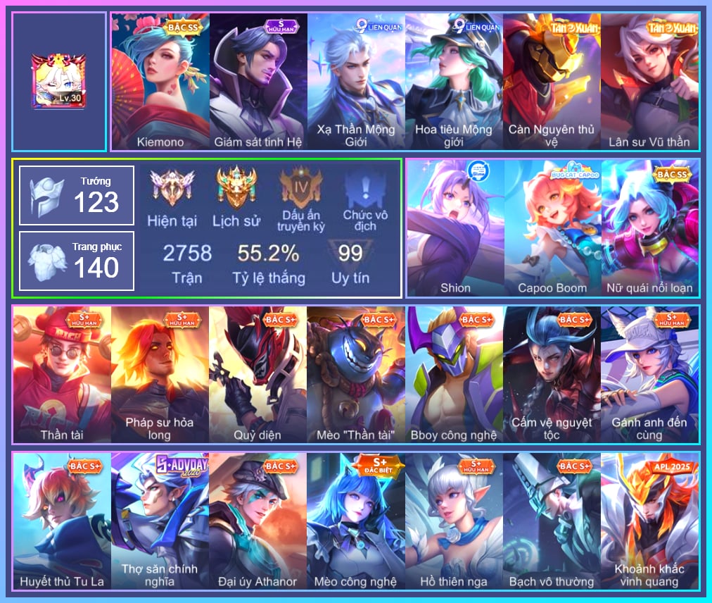 Valhein Hoàng tử Quạ, Valhein Thần tài, Krixi Xứ Sở Thần Tiên, Krixi Cô Tiên Thỏ, Krixi Phó văn nghệ, Krixi Hồ Thiên Nga, Krixi Thuỷ Thủ, Taara Hỏa Ngọc Nữ Đế, Taara Shion, Toro Trung Phong Cắm, Gildur Đại gia học viện, Lữ Bố Hoả Long Chiến Thần, Amily Đặc cảnh NYPD, Amily Hội ám hoàng, Amily Thám tử trung học, Florentino Vũ kiếm sư, Florentino Giám sát tinh hệ, Florentino Thần thoại Hy Lạp, Florentino S-Quang Vinh, Rourke Pháo Thủ Tuộc Neo, Lumburr, Lauriel Đọa Lạc Thiên Sứ, Natalya Quý Cô Thủy Tề, Wisp Hải Tặc Nhí, Fennik Tiệc Bánh Kẹo, Darcy Pháp sư hỏa long, TeeMee Xiếc Cung Đình, Teemee Tay đua siêu tốc, Lindis Quang Vinh, Max Quang Vinh, Max Trà Chanh, Moren Anh thợ điện, Zill Lốc Địa Ngục, Zill Dung nham, Elsu Mafia, Elsu Xạ Thần Mộng Giới, Mganga Hề cung đình, Mganga Doombot Hủy Diệt, Enzo Phẩm chất quý tộc, Richter Bá tước, TelAnnas Cảnh Vệ Rừng, TelAnnas Chung Tình Tiễn, Telannas Thánh nữ mật hội, Telannas Dạ hội, TelAnnas Quang Vinh, Tel Annas Jujutsu Sorcerer, Arduin, Arduin Quang Vinh, Arduin Tà linh hiệp sỹ, Zephys Oán linh, Zephys Phi thương, Zuka Gấu Nhồi Bông, Preyta Không Tặc, Preyta Phi cơ F1, Nakroth BBoy công nghệ, Nakroth Siêu Việt 1, Kriknak Bọ Cánh Bạc, Kriknak Yêu trùng cổ mộ, Murad Thợ Săn Tiền Thưởng, Grakk Khô Lâu Đại Tướng, Grakk Mèo thần tài, KilGroth Cảnh Vệ Biển, KilGroth Càn Nguyên Thủ Vệ, Butterfly Xuân nữ ngổ ngáo, Butterfly Nữ Quái Nổi Loạn, Butterfly Gánh anh đến cùng, Butterfly Bình Minh Tận Thế, Ishar Giấc Mơ Ngọt Ngào, Ishar Capoo Boom, Dirak Cảnh Vệ Bầu Trời, Errol Vượt ngục, Errol Diệt nguyệt tiên phong, Errol Huyết thủ Tu La, Veres Chị đại học đường, Hayate Bạch ảnh, Hayate Quỷ diện, Hayate Bạch vô thường, Yena Hoạt náo viên, Yena Nữ hoàng thể thao, Yena Hoa tiêu Mộng giới, Alice The Butterfly Mansion Girl, Celica S-Quang Vinh, Volkath Quang vinh, Capheny Hầu gái, Krizzix Crursed Corpse, Zip Gà siêu quậy, Violet Nữ đặc cảnh, Violet Phó học tập, Thane Mật vụ, Thane Khoảnh khắc vinh quang, Rouie Quang Vinh, Rouie Mèo hầu gái, Quillen Trưởng ngoại khoa, Astrid Bạch Kiếm Tiểu Thư, Allain Lân sư Vũ thần, Maloch Tiệc hóa trang, Azzenka U Hồn Sa Mạc, Ryoma Thợ Săn Tiền Thưởng, Ryoma Đại Tướng Nguyệt Tộc, Ryoma Dạ hội, Thorne Cận vệ hoàng gia, Thorne Thám tử trung học, Laville Tay súng vô địch, Qi Thiếu nữ pháo hoa, Omega Người máy xanh, Ilumia Nữ Chúa Tuyết, Ata Quang vinh, Airi Cấm Vệ Nguyệt Tộc, Airi Kiemono, Kaine Thợ Săn Chính Nghĩa, Keera Thuỷ thủ, Sephera Quý tiểu thư, Arthur Hoàng kim cốt, Arthur Siêu sao Cricket, Liliana Hồ Quý Phi, Liliana Thuỷ thủ hồ ly, Aleister Quỷ soái nguyệt tộc, Aleister S - Quang Vinh, Dextra Quý cô Tuổi Dần, Arum Nữ hoàng gấu xám, Điêu Thuyền Mèo công nghệ, Superman Chúa Tể Công Lý, Ngộ Không Đạo tặc, Xeniel Thiên Sứ Hủy Diệt, Xeniel Kim sí điểu, Annette Xứ sở thần tiên, Raz Đại tù trưởng, Yan Nghệ nhân trung thu, Roxie Lễ hội hoa, Ignis Nguyệt lão, Ignis Vì sao con khóc, Tulen Đại úy Athanor, Ybneth Hạt trưởng kiểm lâm, Ybneth Candy Bear, Omen Sĩ Quan Viễn Chinh, Omen Chiến binh trăng khuyết, Ming thầy tướng, Sinestrea S-Quang vinh, Marja Linh Xà Tư Tế, Bonnie S Quang Vinh