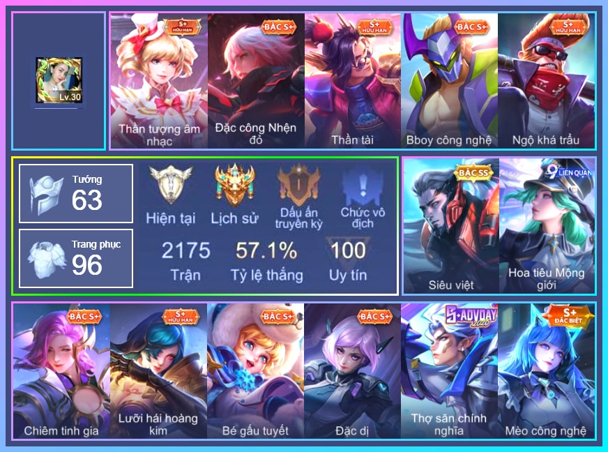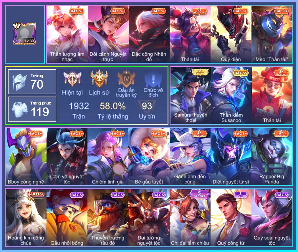 Valhein Hoàng tử Quạ, Valhein Quang Vinh, Valhein S-Quang Vinh, Triệu Vân Thần Tài, Krixi Công chúa Bướm, Krixi Thuỷ Thủ, Veera Phù thủy Hội họa, Mina Lưỡi hái hoàng kim, Mina Đào tạo siêu sao, Taara Hỏa Ngọc Nữ Đế, Natalya Quý Cô Thủy Tề, Gildur phượt thủ, Gildur Đại gia học viện, Kriknak Bọ Cánh Bạc, Murad Siêu việt, Murad Đặc dị, KilGroth Cảnh Vệ Biển, KilGroth Quang Vinh, Grakk Khô Lâu Đại Tướng, Điêu Thuyền Nữ Vương Anh Đào, Điêu Thuyền Mèo công nghệ, Skud Quang Vinh, Zuka Đầu bếp hoàng cung, Airi Thích Khách, Mganga Hề cung đình, Mganga Doombot Hủy Diệt, Violet Nữ đặc cảnh, Violet Đặc Dị, Violet Tay Súng Siêu Phẩm, Violet Huy Chương Vàng, Preyta Phi cơ F1, TeeMee Xiếc Cung Đình, Teemee Tay đua siêu tốc, Lauriel Đọa Lạc Thiên Sứ, Amily Đặc cảnh NYPD, Amily Đặc công nhện đỏ, Amily Hội ám hoàng, Ignis Hỏa Thuật Sư, Ignis Quang Vinh, Lindis Thám Tử Tư, Lindis Quang Vinh, Errol Vượt ngục, Veres Đạo tặc, Butterfly Thủy thủ, Arduin Quang Vinh, Arduin Tà linh hiệp sỹ, Telannas Dạ hội, Zill Dung nham, Zill Thần mộng mị, Arthur Siêu sao Cricket, Nakroth Quân đoàn địa ngục, Nakroth BBoy công nghệ, Ryoma Thợ Săn Tiền Thưởng, Ryoma Đại Tướng Nguyệt Tộc, Ryoma Dạ hội, Capheny Hầu gái, Capheny Thần tượng âm nhạc, Capheny S-Quang Vinh, Elandorr Học viện Carano, Max Quang Vinh, Yena Hoa tiêu Mộng giới, Raz Đại tù trưởng, Richter Quang vinh 2.0, Fennik Tay đua F1, Hayate Bạch ảnh, Dirak Quý tộc, Dirak Ông bầu Showbiz, Wisp Hải Tặc Nhí, Kahlii Siêu đầu bếp, Laville Tay đua đường phố, Laville Tay súng vô địch, Slimz Chú thỏ ngọc, Lorion Chiến giáp hắc ám, Ata Quang vinh, Volkath Tư lệnh viễn chinh, Volkath Quang vinh, Qi Thiếu nữ pháo hoa, Liliana Hồ Quý Phi, Arum Nữ hoàng gấu xám, Sinestrea S-Quang vinh, Ngộ Không Đạo tặc, Ngộ Không Ngộ Khá Trẩu, Ngộ Không Cổ thần Ai Cập, Aleister Quỷ soái nguyệt tộc, Sephera Chiêm tinh gia, Roxie Lễ hội hoa, Thorne Cận vệ hoàng gia, Kaine Thợ Săn Chính Nghĩa, Annette Xứ sở thần tiên, Alice Bé Gấu Tuyết, Alice Xứ sở thần tiên, Omen Sĩ Quan Viễn Chinh, Xeniel Kim sí điểu, Omega Hộ Vệ Carano, Astrid Hoa anh đào, Bonnie S Quang Vinh