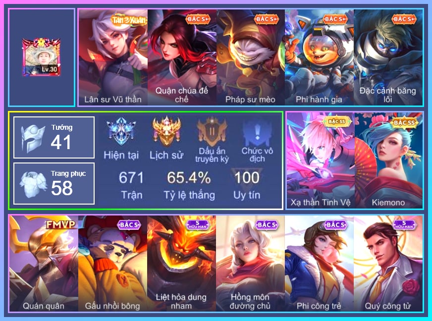 TelAnnas Giám thị thân thiện, TelAnnas Quang Vinh, Valhein Hoàng tử Quạ, Arthur Đặc cảnh băng lôi, Butterfly Quận Chúa Đế Chế, Violet Nữ đặc cảnh, Violet Phi Công Trẻ, Violet Phó học tập, Natalya Phó nháy nhí nhảnh, Liliana Thuỷ thủ hồ ly, Krixi Cô Tiên Thỏ, Krixi Phó văn nghệ, Triệu Vân Quý Công Tử, Allain Lân sư Vũ thần, Maloch Đại ca Mukbang, Raz Đại tù trưởng, Stuart Trò đùa tử vong, Stuart Vua hề, Stuart Gã hề, Grakk Khô Lâu Đại Tướng, Grakk Màu cờ sắc áo, Roxie Lễ hội hoa, Omen Thuyền trưởng hải tặc, Mina Tiểu thư đoạt hồn, Alice Nhà chiêm tinh, Alice Xứ sở thần tiên, Mganga Pháp sư mèo, Mganga Doombot Hủy Diệt, Yorn Đặc Nhiệm Swat, Yorn Soái ca bãi biển, Enzo Chiến binh trăng khuyết, Enzo Nhà Leo núi, Qi Blogger Ẩm thực, Rouie Quang Vinh, Fennik Nhà thám hiểm, Fennik Phi hành gia, Zill Thần mộng mị, Laville Xạ Thần Tinh Vệ, Capheny S-Quang Vinh, Nakroth Quán quân, KilGroth Cảnh Vệ Biển, Ignis Thần mặt trời, Taara Hồng môn đường chủ, Lauriel Nữ vương học đường 2, Murad S-Quang Vinh, Richter Quang vinh 2.0, Airi Kiemono, Azzenka Quang Vinh 2.0, Xeniel Kim sí điểu, Xeniel Shipper bánh mỳ, Zuka Gấu Nhồi Bông, Quillen Trưởng ngoại khoa, Volkath Quang vinh, Rourke Pháo Thủ Tuộc Neo, Hayate Bạch ảnh, Baldum Liệt hỏa dung nham, Ryoma Thợ Săn Tiền Thưởng, Bonnie S Quang Vinh