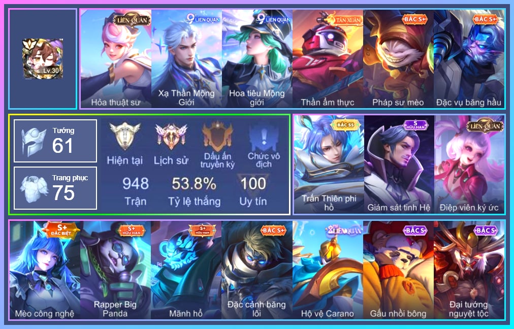 Arthur Siêu sao Cricket, Arthur Đặc cảnh băng lôi, Krixi Phó văn nghệ, Telannas Dạ hội, Valhein Hoàng tử Quạ, Butterfly Teen Nữ Công Nghệ, Violet Huy Chương Vàng, Zuka Gấu Nhồi Bông, Zuka Đầu bếp hoàng cung, Zuka Mãnh hổ, Zuka Rapper Big Panda, Alice Dạ hội, Triệu Vân Quý Công Tử, Điêu Thuyền Mèo công nghệ, Max Hiệp Sĩ Nhí, Max Chuyên gia đập hộp, Grakk Thần ẩm thực, Wisp Hải Tặc Nhí, Yorn Cung thủ bóng đêm, Yorn Đặc Nhiệm Swat, Kriknak Bọ Cánh Bạc, Lữ Bố Vũ điệu Samba, Murad Thợ Săn Tiền Thưởng, Murad S-Quang Vinh, Ngộ Không Đặc vụ băng hầu, Richter Quang vinh 2.0, Mganga Pháp sư mèo, Omen Sĩ Quan Viễn Chinh, Omen Thuyền trưởng hải tặc, Zephys Đầu bếp Sashimi, Omega Hộ Vệ Carano, Gildur Đại gia học viện, Florentino Vũ kiếm sư, Florentino Giám sát tinh hệ, Florentino Thần thoại Hy Lạp, Florentino Hisoka, Florentino S-Quang Vinh, KilGroth Cảnh Vệ Biển, Yena Nữ hoàng thể thao, Yena Hoa tiêu Mộng giới, Azzenka Quang Vinh 2.0, Maloch Ác nhân vô tuyến, Maloch Đại ca Mukbang, Raz Đại tù trưởng, Raz Saitama Cosplay, Zill Thần mộng mị, Fennik Nhà thám hiểm, Errol Vượt ngục, Roxie Cháy Phố, Roxie Hỏa thuật sư, Aya Điệp viên ký ức, Skud Mafia, Capheny Hầu gái, Capheny S-Quang Vinh, Keera Hồ điệp, Xeniel Shipper bánh mỳ, Baldum Đồ chơi, Quillen Trưởng ngoại khoa, Celica S-Quang Vinh, Yan Giấc mơ sao, Annette Xứ sở thần tiên, Ormarr Giáo Viên Thể Hình, Slimz Sứ giả Thiên giới, Hayate Bạch ảnh, Hayate Bạch lang, Sinestrea S-Quang vinh, Enzo Phẩm chất quý tộc, Enzo Nhà Leo núi, Ryoma Thợ Săn Tiền Thưởng, Ryoma Đại Tướng Nguyệt Tộc, Volkath Quang vinh, Lauriel Đọa Lạc Thiên Sứ, Elsu Trấn thiên phi hồ, Elsu Xạ Thần Mộng Giới, Aleister S - Quang Vinh