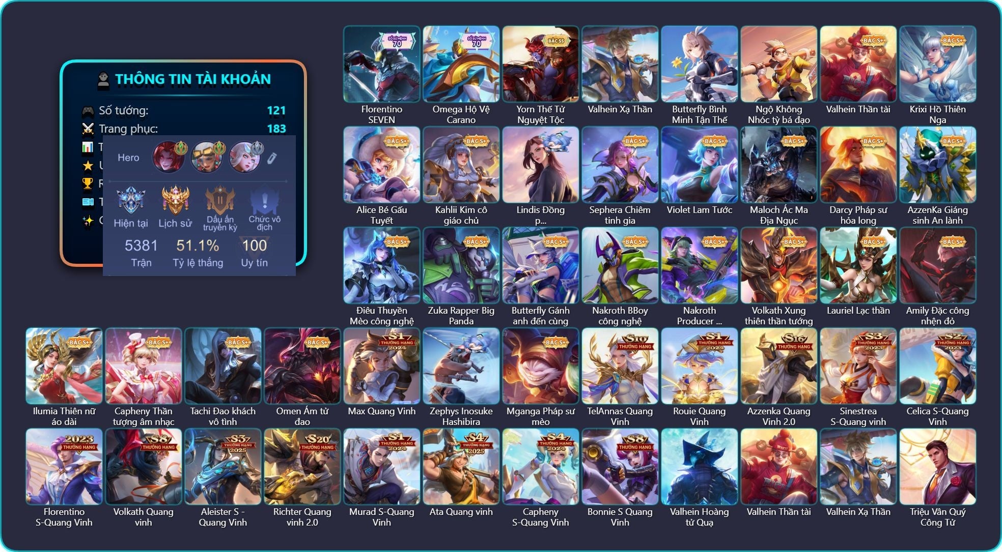 Valhein Hoàng tử Quạ, Valhein Thần tài, Valhein Xạ Thần, Triệu Vân Quý Công Tử, Krixi Cô Tiên Thỏ, Krixi Phó văn nghệ, Krixi Hồ Thiên Nga, Krixi Thuỷ Thủ, Gildur phượt thủ, Gildur Đại gia học viện, Yorn Cung thủ bóng đêm, Yorn Thế Tử Nguyệt Tộc, Toro Đặc cảnh NYPD, Toro Bạch mao Ngưu, Mina Chị đại lắm chiêu, Mina Đào tạo siêu sao, Alice Bé Gấu Tuyết, Alice Dạ hội, Alice The Butterfly Mansion Girl, Max Hiệp Sĩ Nhí, Max Quang Vinh, Max Chuyên gia đập hộp, Taara Đại tù trưởng, Taara Hỏa Ngọc Nữ Đế, Natalya Quý Cô Thủy Tề, Elandorr Phi vụ thế kỷ, Elandorr Học viện Carano, Mganga Hề cung đình, Mganga Pháp sư mèo, Mganga Doombot Hủy Diệt, Kahlii Kim cô giáo chủ, Kahlii Siêu đầu bếp, Veera Y Tá Bạo Loạn, Veera Thiên nga đen, Paine khúc nhạc tử vong, Stuart Trò đùa tử vong, Stuart Gã hề, Kriknak Yêu trùng cổ mộ, Zephys Phi thương, Zephys Tư lệnh viễn chinh, Zephys Inosuke Hashibira, Zephys Đầu bếp Sashimi, Annette Nữ quản ga, Annette Xứ sở thần tiên, Teemee Tay đua siêu tốc, Sephera Chiêm tinh gia, Sephera Phi vụ thế kỷ, TelAnnas Cảnh Vệ Rừng, TelAnnas Chung Tình Tiễn, TelAnnas Quang Vinh, Tel Annas Jujutsu Sorcerer, Violet Nữ đặc cảnh, Violet Huy Chương Vàng, Violet Lam Tước, Errol Diệt nguyệt tiên phong, Arthur Hoàng kim cốt, Arthur Si Tình Kiếm, Arthur Siêu sao Cricket, Yena Khuyên Bạc, Yena Hoạt náo viên, Yena Nữ hoàng thể thao, Yena Nữ cướp biển, Rouie Quang Vinh, Wonder Woman Thế Chiến, Ignis Hỏa Thuật Sư, Ignis Bắc băng vương, Fennik Nhà thám hiểm, Fennik Tay đua F1, Fennik Shipper Siêu thanh, Preyta Phi cơ F1, Astrid Bạch Kiếm Tiểu Thư, Maloch Ác Ma Địa Ngục, Maloch Tiệc hóa trang, Maloch Samurai Tử Sĩ, Maloch Ác nhân vô tuyến, Omega Hộ vệ ba bích, Omega Hộ Vệ Carano, Darcy Pháp sư hỏa long, Azzenka Quang Vinh 2.0, AzzenKa Giáng sinh An lành, Dirak Cảnh Vệ Bầu Trời, Dirak Quý tộc, Dirak Ông bầu Showbiz, Ishar Giấc Mơ Ngọt Ngào, Điêu Thuyền Nữ Vương Anh Đào, Điêu Thuyền Nữ y tá, Điêu Thuyền Hoa Hậu, Điêu Thuyền Mèo công nghệ, Thane Kẻ Hủy Diệt, Zuka Phát Tài, Zuka Đầu bếp hoàng cung, Zuka Rapper Big Panda, Grakk Màu cờ sắc áo, Butterfly Teen Nữ Công Nghệ, Butterfly Gánh anh đến cùng, Butterfly Bình Minh Tận Thế, Lữ Bố Kỵ Sĩ Âm Phủ, Moren Anh thợ điện, Nakroth Quân đoàn địa ngục, Nakroth BBoy công nghệ, Nakroth Producer Tia chớp, Arduin, Arduin Tà linh hiệp sỹ, KilGroth Cảnh Vệ Biển, Liliana Hồ Quý Phi, Liliana Thuỷ thủ hồ ly, Laville Tay đua đường phố, Laville Tay súng vô địch, Sinestrea Lữ khách sa mạc, Sinestrea S-Quang vinh, Zill Thần mộng mị, Lumburr Dung Nham, Celica Nữ cao bồi, Celica S-Quang Vinh, Airi Đặc công tử điệp, Airi Lễ hội mùa xuân, Allain Lân sư Vũ thần, Slimz Thỏ nhồi bông, Slimz Sứ giả Thiên giới, Slimz Siêu Cấp Tối Thượng, Florentino Vũ kiếm sư, Florentino Kiếm sĩ Olympic, Florentino SEVEN, Florentino S-Quang Vinh, Wisp Ếch nhồi bông, Quillen Trưởng ngoại khoa, Quillen Sao đỏ học đường, Quillen Huyết phong, Volkath Xung thiên thần tướng, Volkath Tư lệnh viễn chinh, Volkath Quang vinh, Cresht Thợ sửa cáp, Aleister Thiếu Niên Hắc Ám, Aleister S - Quang Vinh, Marja Linh Xà Tư Tế, Arum Nữ hoàng gấu xám, Richter Quang vinh 2.0, Lauriel Đọa Lạc Thiên Sứ, Lauriel Lạc thần, Ryoma Thợ Săn Tiền Thưởng, Ryoma Dạ hội, Dextra Quý cô Tuổi Dần, Baldum Thế Giới Kẹo Ngọt, Kaine Thợ Săn Chính Nghĩa, Lindis Thám Tử Tư, Lindis Đồng phục Shihakusho, Murad S-Quang Vinh, Roxie Thám tử tập sự, Roxie Hầu gái, Roxie Tiệc bánh kẹo, Roxie Lễ hội hoa, Roxie Hỏa thuật sư, Ngộ Không Nhóc tỳ bá đạo, Ngộ Không Cổ thần Ai Cập, Amily Đặc cảnh NYPD, Amily Đặc công nhện đỏ, Amily Hội ám hoàng, Jinna Hỏa nhãn ma vương, Ilumia Thiên nữ áo dài, Ilumia Diva nổi loạn, Tulen Phù Thủy Kiến Tạo, Tulen Phó kỷ luật, Tulen Dạ hội, Ata Quang vinh, Ata Mèo đi mưa, Keera Thuỷ thủ, Aya Điệp viên ký ức, Capheny Hầu gái, Capheny Thần tượng âm nhạc, Capheny S-Quang Vinh, Qi Tiểu long, Qi Thiếu nữ pháo hoa, Qi Blogger Ẩm thực, Hayate Bạch ảnh, Hayate Bạch lang, Tachi Đao khách vô tình, Xeniel Thiên Sứ Hủy Diệt, Veres Gián điệp tinh hệ, Enzo Nhà Leo núi, Omen Ám tử đao, Bonnie S Quang Vinh, Krizzix Crursed Corpse, Dolia Môn đồ tập sự