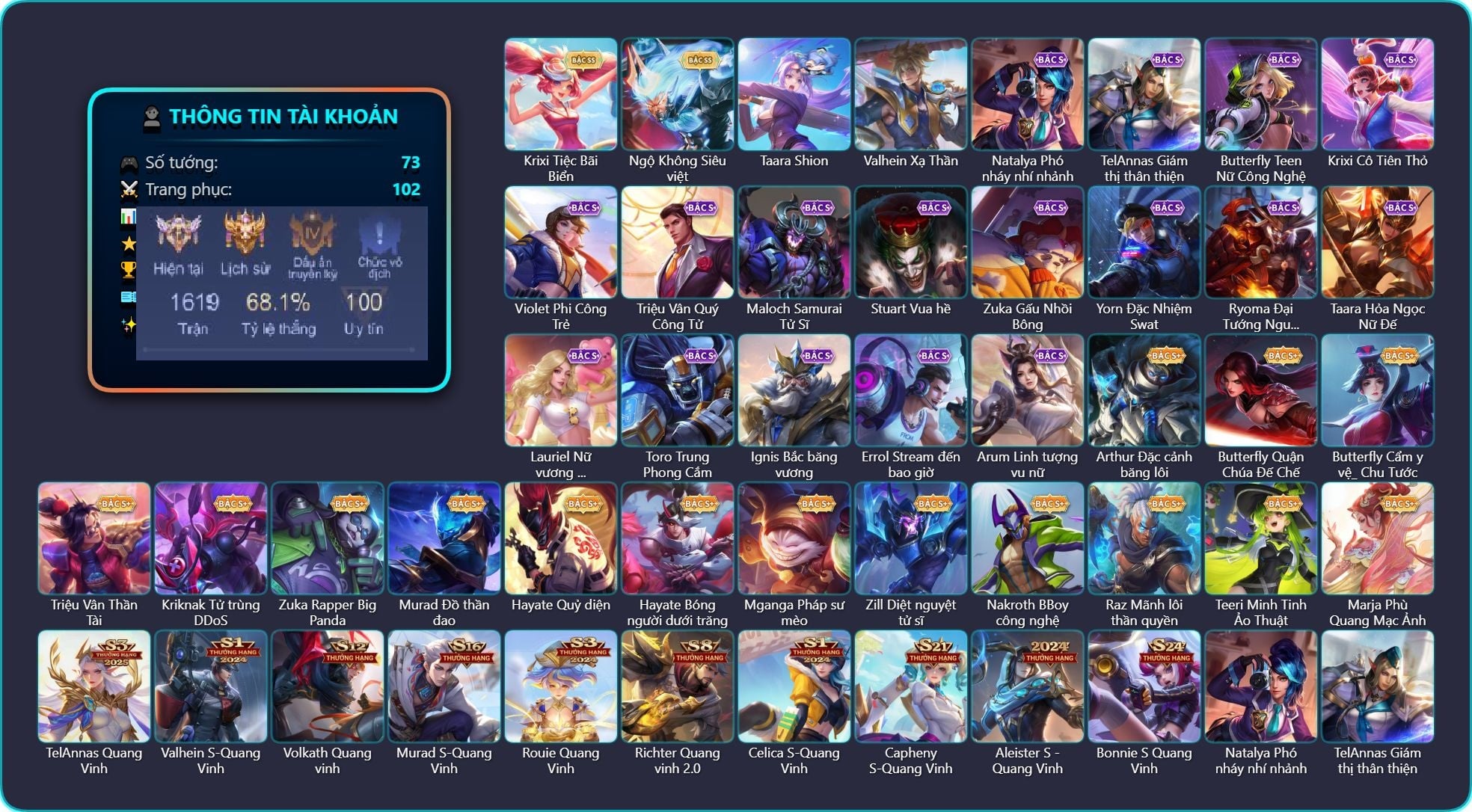 Natalya Phó nháy nhí nhảnh, TelAnnas Giám thị thân thiện, Telannas Thánh nữ mật hội, Telannas Dạ hội, TelAnnas Quang Vinh, Valhein Hoàng tử Quạ, Valhein Xạ Thần, Valhein S-Quang Vinh, Arthur Hoàng kim cốt, Arthur Siêu sao Cricket, Arthur Đặc cảnh băng lôi, Butterfly Teen Nữ Công Nghệ, Butterfly Quận Chúa Đế Chế, Butterfly Cẩm y vệ_ Chu Tước, Krixi Tiệc Bãi Biển, Krixi Cô Tiên Thỏ, Krixi Phó văn nghệ, Violet Phi Công Trẻ, Violet Phó học tập, Triệu Vân Quý Công Tử, Triệu Vân Thần Tài, Maloch Samurai Tử Sĩ, Maloch Ác nhân vô tuyến, Maloch Đại ca Mukbang, Stuart Vua hề, Stuart Gã hề, Slimz Lẩu chua cay, Slimz Sứ giả Thiên giới, Kriknak Bọ Cánh Bạc, Kriknak Tử trùng DDoS, Grakk Khô Lâu Đại Tướng, Alice Xứ sở thần tiên, Alice The Butterfly Mansion Girl, Zephys Phi thương, Zephys Tư lệnh viễn chinh, Mina Tiểu thư đoạt hồn, Mina Đào tạo siêu sao, Amily Nữ đội trưởng, Amily Khủng long xanh, Zuka Gấu Nhồi Bông, Zuka Đầu bếp hoàng cung, Zuka Rapper Big Panda, Omen Thuyền trưởng hải tặc, Ngộ Không Siêu việt, Ngộ Không Cổ thần Ai Cập, Yorn Đặc Nhiệm Swat, Ryoma Đại Tướng Nguyệt Tộc, Ryoma Dạ hội, Omega Hộ vệ ba bích, Gildur Đại gia học viện, Taara Hỏa Ngọc Nữ Đế, Taara Tư lệnh hải âu, Taara Shion, Yena Nữ hoàng thể thao, Yena Hoa tiêu Mộng giới, Lauriel Nữ vương học đường 2, Volkath Quang vinh, Murad Đồ thần đao, Murad S-Quang Vinh, Hayate Bạch ảnh, Hayate Quỷ diện, Hayate Bạch lang, Hayate Bóng người dưới trăng, Kahlii Siêu đầu bếp, Mganga Pháp sư mèo, Toro Trung Phong Cắm, Rouie Quang Vinh, Zill Diệt nguyệt tử sĩ, Zill Thần mộng mị, Fennik Nhà thám hiểm, Fennik Đội đặc nhiệm, Fennik Shipper Siêu thanh, Nakroth BBoy công nghệ, Richter Quang vinh 2.0, Ignis Bắc băng vương, Celica S-Quang Vinh, Sephera Thủy Liên Hoa, Keera Học viên Carano, Keera Hồ điệp, Errol Stream đến bao giờ, Arduin, Arduin Organ cổ quái, Dirak Đường chủ yêu giới, Annette Xứ sở thần tiên, Raz Đại tù trưởng, Raz Mãnh lôi thần quyền, Capheny S-Quang Vinh, Xeniel Kim sí điểu, Xeniel Shipper bánh mỳ, Baldum Đồ chơi, Elsu Mafia, Elsu Xạ Thần Mộng Giới, Aleister Thiếu Niên Hắc Ám, Aleister S - Quang Vinh, KilGroth Cảnh Vệ Biển, Enzo Phẩm chất quý tộc, Bonnie S Quang Vinh, Liliana Thuỷ thủ hồ ly, Ilumia Diva nổi loạn, Teeri Minh Tinh Ảo Thuật, Arum Linh tượng vu nữ, Marja Phù Quang Mạc Ảnh