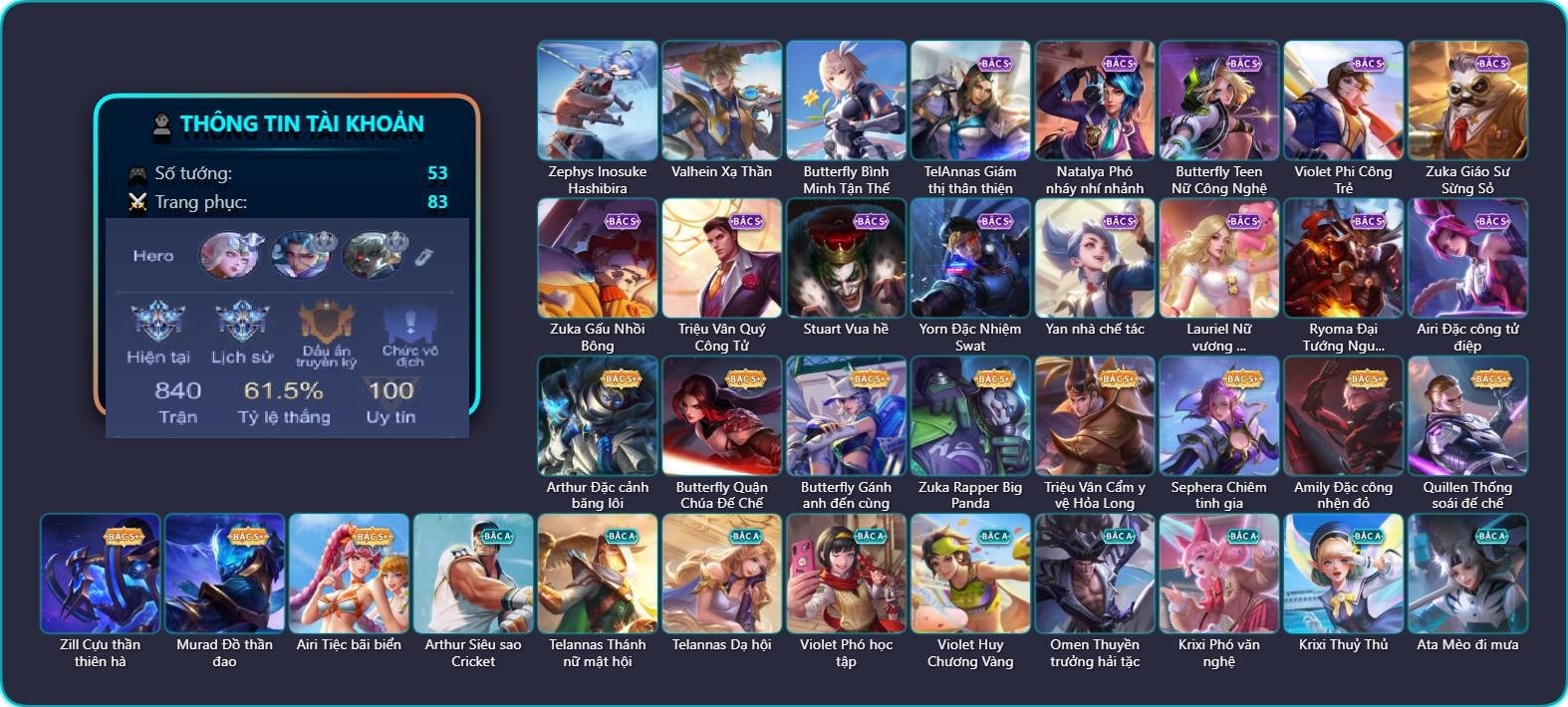 Arthur Siêu sao Cricket, Arthur Đặc cảnh băng lôi, TelAnnas Giám thị thân thiện, TelAnnas Chung Tình Tiễn, Telannas Thánh nữ mật hội, Telannas Dạ hội, TelAnnas Quang Vinh, Valhein Xạ Thần, Natalya Phó nháy nhí nhảnh, Butterfly Teen Nữ Công Nghệ, Butterfly Quận Chúa Đế Chế, Butterfly Gánh anh đến cùng, Butterfly Bình Minh Tận Thế, Violet Phi Công Trẻ, Violet Phó học tập, Violet Huy Chương Vàng, Omen Thuyền trưởng hải tặc, Krixi Phó văn nghệ, Krixi Thuỷ Thủ, Ata Mèo đi mưa, Zuka Giáo Sư Sừng Sỏ, Zuka Phát Tài, Zuka Gấu Nhồi Bông, Zuka Rapper Big Panda, Triệu Vân Quý Công Tử, Triệu Vân Cẩm y vệ Hỏa Long, Alice Nhà chiêm tinh, Alice Xứ sở thần tiên, Alice The Butterfly Mansion Girl, Veera Thiên nga đen, Stuart Vua hề, Yorn Cung thủ bóng đêm, Yorn Đặc Nhiệm Swat, Roxie Lễ hội hoa, Ngộ Không Cổ thần Ai Cập, Mina Đào tạo siêu sao, Errol Vượt ngục, Sephera Chiêm tinh gia, Amily Đặc công nhện đỏ, Amily Nữ đội trưởng, Qi Blogger Ẩm thực, Raz Đại tù trưởng, Omega Hộ vệ ba bích, Florentino Vũ kiếm sư, Florentino Kiếm sĩ Olympic, Keera Y tá lạ, Keera Học viên Carano, Tulen Phù Thủy Kiến Tạo, Quillen Thống soái đế chế, Zephys Tư lệnh viễn chinh, Zephys Inosuke Hashibira, Yan nhà chế tác, Liliana Hồ Quý Phi, Lauriel Đọa Lạc Thiên Sứ, Lauriel Nữ vương học đường 2, Zill Lốc Địa Ngục, Zill Cựu thần thiên hà, Hayate Bạch lang, Thorne Cận vệ hoàng gia, Murad Đồ thần đao, Murad S-Quang Vinh, Rouie Quang Vinh, Fennik Nhà thám hiểm, Fennik Shipper Siêu thanh, Mganga Doombot Hủy Diệt, Yena Nữ hoàng thể thao, Gildur Đại gia học viện, Kahlii Tử điệp, Richter Quang vinh 2.0, Ryoma Thợ Săn Tiền Thưởng, Ryoma Đại Tướng Nguyệt Tộc, Ishar Giấc Mơ Ngọt Ngào, Xeniel Kim sí điểu, Annette Xứ sở thần tiên, Volkath Quang vinh, KilGroth Cảnh Vệ Biển, Ybneth Hạt trưởng kiểm lâm, Airi Tiệc bãi biển, Airi Đặc công tử điệp, Airi Quản lý tài năng, Ignis Hỏa Thuật Sư, Astrid Bạch Kiếm Tiểu Thư, Aleister S - Quang Vinh