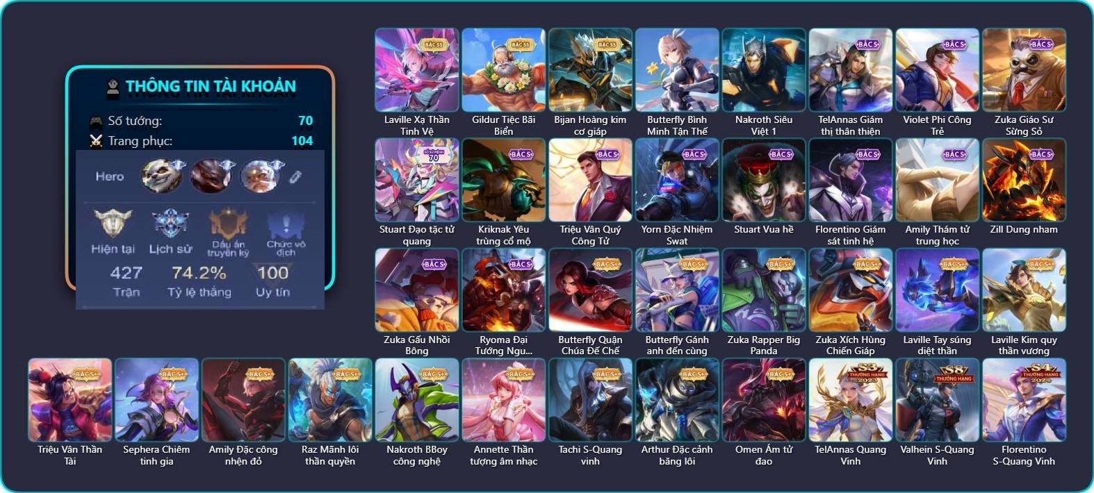 TelAnnas Giám thị thân thiện, Telannas Thánh nữ mật hội, Telannas Dạ hội, TelAnnas Quang Vinh, Tel Annas Jujutsu Sorcerer, Valhein S-Quang Vinh, Arthur Siêu sao Cricket, Arthur Đặc cảnh băng lôi, Butterfly Quận Chúa Đế Chế, Butterfly Gánh anh đến cùng, Butterfly Bình Minh Tận Thế, Violet Phi Công Trẻ, Violet Phó học tập, Krixi Phó văn nghệ, Krixi Thuỷ Thủ, Zuka Đại Phú Ông, Zuka Giáo Sư Sừng Sỏ, Zuka Phát Tài, Zuka Gấu Nhồi Bông, Zuka Rapper Big Panda, Zuka Xích Hùng Chiến Giáp, Alice Xứ sở thần tiên, Laville Tay đua đường phố, Laville Tay súng diệt thần, Laville Xạ Thần Tinh Vệ, Laville Kim quy thần vương, Kriknak Yêu trùng cổ mộ, Gildur Tiệc Bãi Biển, Triệu Vân Quý Công Tử, Triệu Vân Thần Tài, Zephys Tư lệnh viễn chinh, Yorn Đặc Nhiệm Swat, Allain Lân sư Vũ thần, Stuart Vua hề, Stuart Đạo tặc tử quang, Florentino Vũ kiếm sư, Florentino Giám sát tinh hệ, Florentino S-Quang Vinh, Hayate Bạch ảnh, Slimz Siêu Cấp Tối Thượng, Sephera Quý tiểu thư, Sephera Chiêm tinh gia, Grakk Thần ẩm thực, Roxie Lễ hội hoa, Roxie Hỏa thuật sư, Amily Đặc công nhện đỏ, Amily Thám tử trung học, Errol Vượt ngục, Raz Đại tù trưởng, Raz Mãnh lôi thần quyền, Raz MC Võ đài, Nakroth Quân đoàn địa ngục, Nakroth BBoy công nghệ, Nakroth Siêu Việt 1, Mganga Doombot Hủy Diệt, Thorne Cận vệ hoàng gia, Zill Dung nham, Zill Thần mộng mị, Sinestrea Giấc mơ trưa, Sinestrea S-Quang vinh, Skud Cứu hộ, Ryoma Thợ Săn Tiền Thưởng, Ryoma Đại Tướng Nguyệt Tộc, Ryoma Dạ hội, Omega Hộ vệ ba bích, Annette Xứ sở thần tiên, Annette Thần tượng âm nhạc, Thane Kẻ Hủy Diệt, Thane Khoảnh khắc vinh quang, Yena Nữ hoàng thể thao, Yena Hoa tiêu Mộng giới, Azzenka Quang Vinh 2.0, Elsu Cảnh vệ thảo nguyên, Elsu Mafia, Elsu Xạ thủ tinh linh, Elsu Xạ Thần Mộng Giới, Baldum Liệt hỏa dung nham, Tachi S-Quang vinh, Aoi Quán Quân, Omen Sĩ Quan Viễn Chinh, Omen Ám tử đao, Lindis Thám Tử Tư, Liliana Hồ Quý Phi, Liliana Thuỷ thủ hồ ly, Xeniel Thiên Sứ Hủy Diệt, Xeniel Kim sí điểu, Murad Thợ Săn Tiền Thưởng, Dirak Cảnh Vệ Bầu Trời, KilGroth Cảnh Vệ Biển, Enzo Phẩm chất quý tộc, Volkath Quang vinh, Marja Linh Xà Tư Tế, TeeMee Xiếc Cung Đình, Ybneth Hạt trưởng kiểm lâm, Ybneth Candy Bear, Max Trà Chanh, Ming thầy tướng, Bonnie S Quang Vinh, Bijan Hoàng kim cơ giáp, Bijan Giai Điệu Giáng Sinh, Zip Gà siêu quậy, Kaine Thợ Săn Chính Nghĩa, Ignis Hỏa Thuật Sư, Krizzix Crursed Corpse