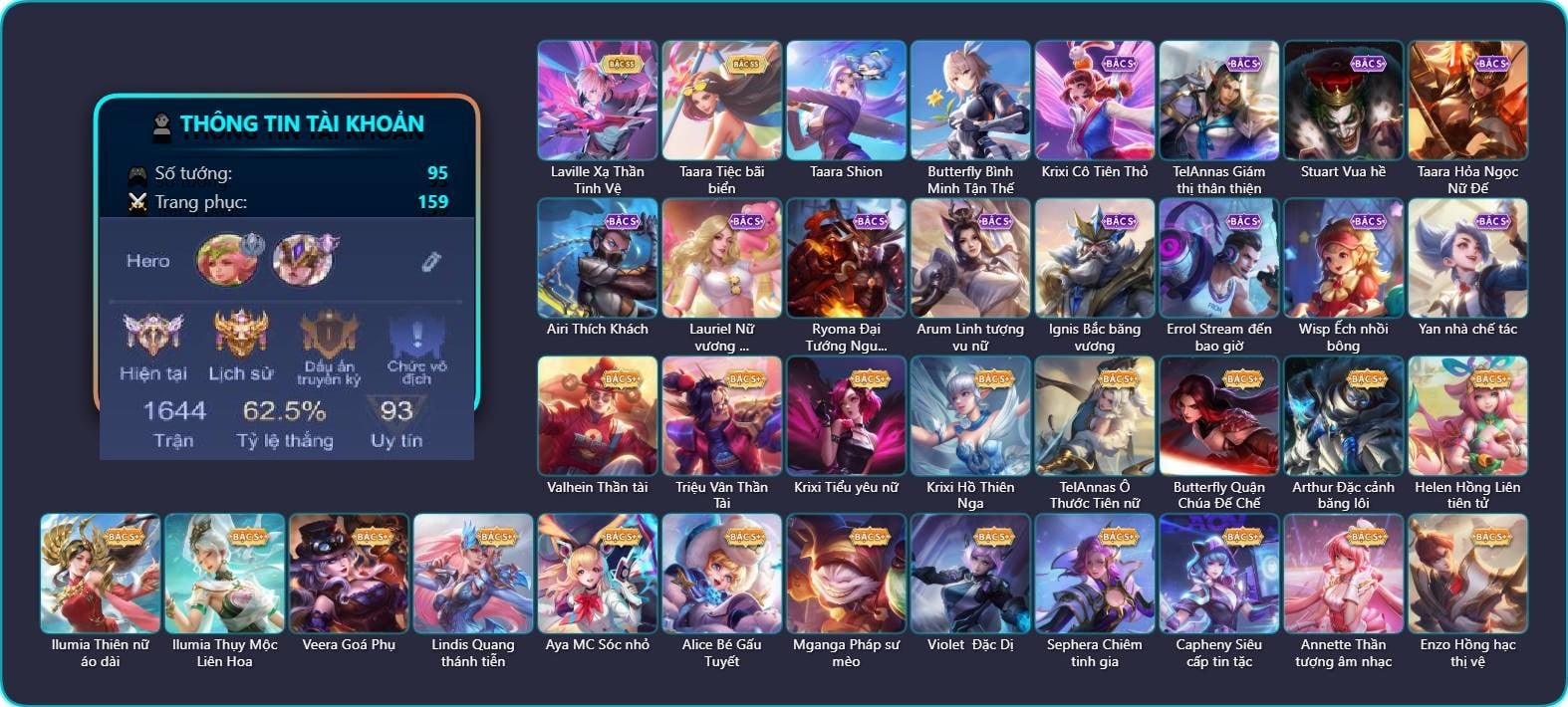 Valhein Thần tài, Valhein S-Quang Vinh, Triệu Vân Thần Tài, Krixi Cô Tiên Thỏ, Krixi Phó văn nghệ, Krixi Tiểu yêu nữ, Krixi Hồ Thiên Nga, Krixi Thuỷ Thủ, Zephys Đầu bếp Sashimi, TelAnnas Cảnh Vệ Rừng, TelAnnas Giám thị thân thiện, Telannas Dạ hội, TelAnnas Quang Vinh, TelAnnas Ô Thước Tiên nữ, Butterfly Quận Chúa Đế Chế, Butterfly Bình Minh Tận Thế, Arthur Hoàng kim cốt, Arthur Đặc cảnh băng lôi, Helen Hồng Liên tiên tử, Laville Xạ Thần Tinh Vệ, Laville Thám tử học đường, Laville S Quang Vinh, Natalya Quý Cô Thủy Tề, Ilumia Nữ Chúa Tuyết, Ilumia Thiên nữ áo dài, Ilumia Diva nổi loạn, Ilumia Ngược dòng thời gian, Ilumia Thụy Mộc Liên Hoa, Allain Lân sư Vũ thần, Veera Goá Phụ, Veera Thiên nga đen, Stuart Vua hề, Grakk Khô Lâu Đại Tướng, Grakk Thần ẩm thực, KilGroth Cảnh Vệ Biển, KilGroth Càn Nguyên Thủ Vệ, Toro Bạch mao Ngưu, Toro Thần thoại Hy Lạp, Ngộ Không Đạo tặc, Lindis Thám Tử Tư, Lindis Quang thánh tiễn, Amily Hội ám hoàng, Amily Nữ đội trưởng, Aya Hoạt náo viên, Aya MC Sóc nhỏ, Mina Tiểu thư đoạt hồn, Mina Đào tạo siêu sao, Qi Thiếu nữ pháo hoa, Qi Blogger Ẩm thực, Kahlii Siêu đầu bếp, Kahlii Tử điệp, Kahlii Rối Nước Thuỷ Đình, Dextra Quý cô Tuổi Dần, Alice Nhà chiêm tinh, Alice Bé Gấu Tuyết, Alice Dạ hội, Alice The Butterfly Mansion Girl, Mganga Pháp sư mèo, Mganga Doombot Hủy Diệt, Xeniel Kim sí điểu, Xeniel Shipper bánh mỳ, Taara Hỏa Ngọc Nữ Đế, Taara Tiệc bãi biển, Taara Tư lệnh hải âu, Taara Shion, Murad S-Quang Vinh, Rouie Sứ giả vũ trụ, Rouie Quang Vinh, Bright Kỳ Lân Soái, Chaugnar Ác Mộng Sinh Hóa, Violet Phó học tập, Violet Đặc Dị, Violet Huy Chương Vàng, Ata Tân thủy thủ, Ata Mèo đi mưa, Sephera Quý tiểu thư, Sephera Chiêm tinh gia, Sephera Phi vụ thế kỷ, Sephera Thủy Liên Hoa, Slimz Sứ giả Thiên giới, Slimz Siêu Cấp Tối Thượng, Airi Thích Khách, Airi Quản lý tài năng, Aleister S - Quang Vinh, Lauriel Đọa Lạc Thiên Sứ, Lauriel Nữ vương học đường 2, Ryoma Thợ Săn Tiền Thưởng, Ryoma Đại Tướng Nguyệt Tộc, Ryoma Ailing Samurai, Yena Khuyên Bạc, Yena Nữ cướp biển, Yena Hoa tiêu Mộng giới, Zill Thần mộng mị, Astrid Bạch Kiếm Tiểu Thư, Arum Linh tượng vu nữ, Arum Thần tượng nhạc Rock, Bonnie S Quang Vinh, Ignis Hỏa Thuật Sư, Ignis Bắc băng vương, Ignis Nguyệt lão, Elandorr Soái tặc, Capheny Hầu gái, Capheny Siêu cấp tin tặc, Capheny S-Quang Vinh, Fennik Nhà thám hiểm, Fennik Đội đặc nhiệm, Errol Stream đến bao giờ, Krizzix Cún siêu quậy, Florentino S-Quang Vinh, Baldum Thế Giới Kẹo Ngọt, Wisp Hải Tặc Nhí, Wisp Ếch nhồi bông, Annette Xứ sở thần tiên, Annette Thần tượng âm nhạc, Annette Vân mộng tiên tử, Annette Doombot thơ ngây, Enzo Thần thoại Hy Lạp, Enzo Nhà Leo núi, Enzo Hồng hạc thị vệ, Thorne Ước nguyện giáng sinh, Yorn Soái ca bãi biển, Yorn Thương Nhân Sa Mạc, Teeri Minh Tinh Ảo Thuật, Zuka Rapper Big Panda, Zuka Xích Hùng Chiến Giáp, Richter Quang vinh 2.0, Richter Cứu hộ, Roxie Hầu gái, Roxie Tiệc bánh kẹo, Yue Tiểu công Chúa, Azzenka Quang Vinh 2.0, AzzenKa Giáng sinh An lành, Azzenka U Hồn Sa Mạc, Omen Thuyền trưởng hải tặc, Điêu Thuyền Nữ y tá, Điêu thuyền Vũ điệu nghê thường, Sinestrea Giấc mơ trưa, Sinestrea Lữ khách sa mạc, Sinestrea S-Quang vinh, Skud Mafia, Tachi S-Quang vinh, Liliana Hồ Quý Phi, Liliana Thuỷ thủ hồ ly, Celica S-Quang Vinh, Ishar Giấc Mơ Ngọt Ngào, Ishar Quận chúa sông Nile, Yan nhà chế tác, Dolia Môn đồ tập sự, Kaine Thợ Săn Chính Nghĩa, Nakroth Producer Tia chớp, Elsu Xạ Thần Mộng Giới, Volkath Quang vinh, Thane Khoảnh khắc vinh quang, Marja Linh Xà Tư Tế, Marja Phù Quang Mạc Ảnh, Max Trà Chanh, Dirak Cảnh Vệ Bầu Trời, TeeMee Xiếc Cung Đình, Bijan Giai Điệu Giáng Sinh